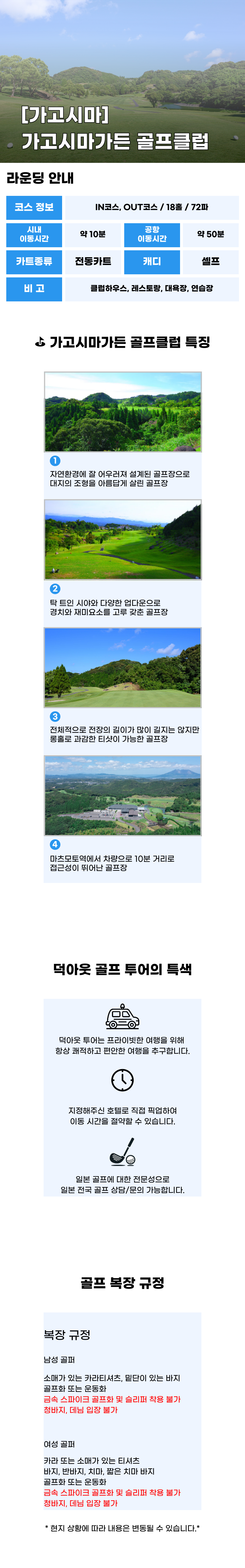 예약 확정 후 기재해주신 호텔 로비 혹은 가고시마 공항에서 티업 시간에 맞춰 픽업 합니다. 해당 상품은 골프장 단가이며, 차량 송영 필요시 옵션에서 추가 선택 가능합니다.