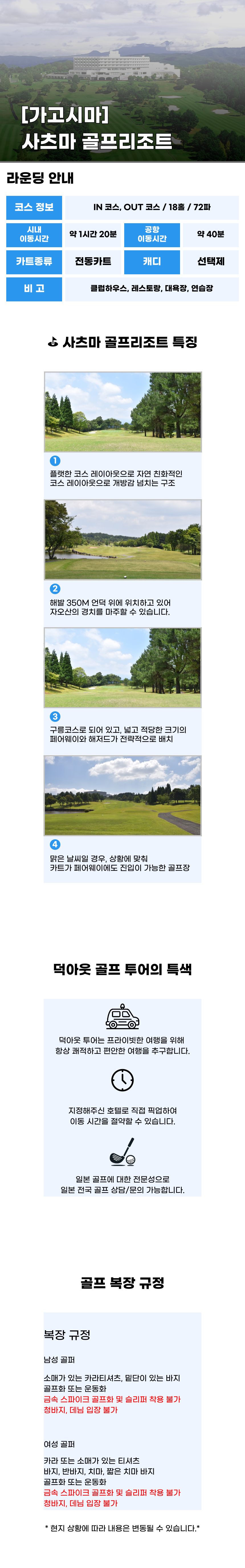 예약 확정 후 기재해주신 호텔 로비 혹은 가고시마 공항에서 티업 시간에 맞춰 픽업 합니다. 해당 상품은 골프장 단가이며, 차량 송영 필요시 옵션에서 추가 선택 가능합니다.