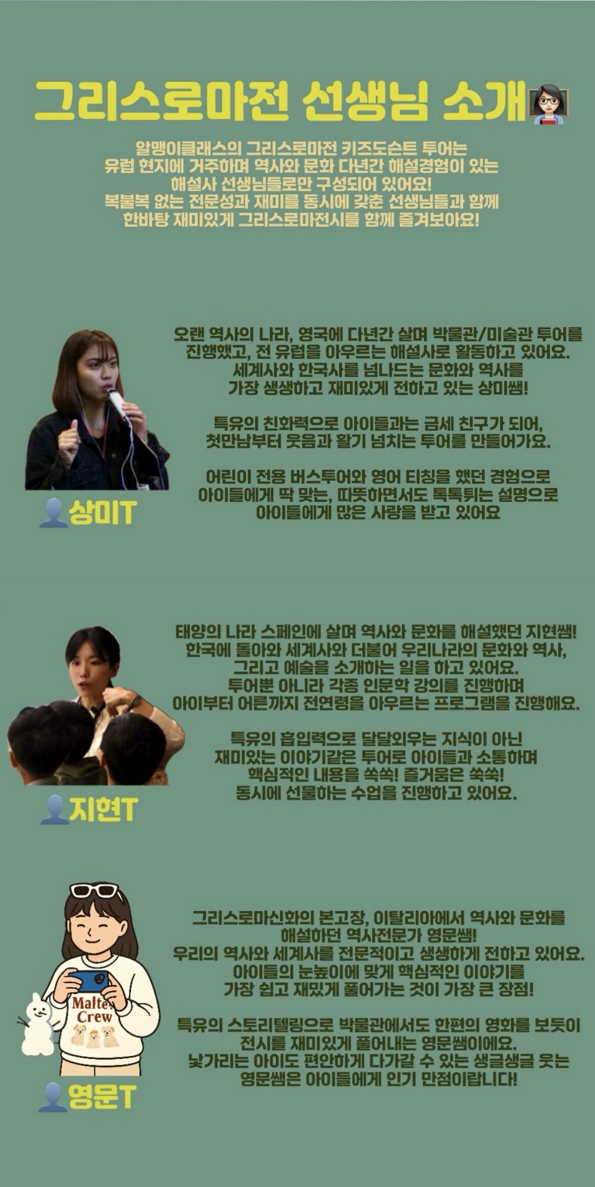 유럽에서 다년간 현지가이드로 활동하고 있는 선생님이 아이들에게 역사 문화 예술을 알리는 가이드로 활동하고 있습니다.😆
