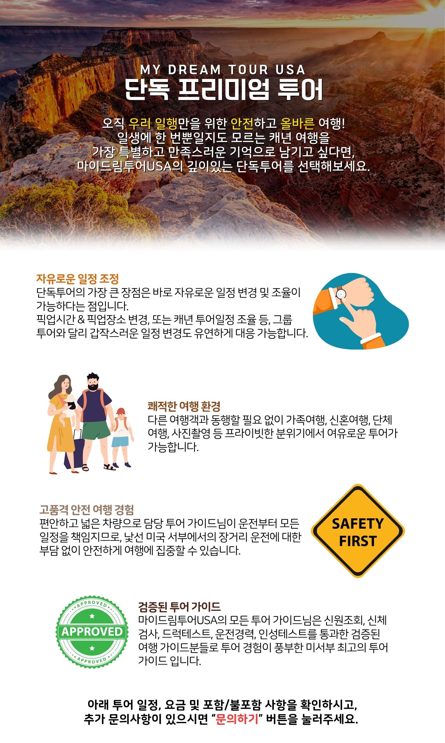 미국 서부 최고의 명소를 단 하루에 볼수있는 실속있는 상품으로서, 그랜드캐년 사우스림, 엔텔로프 캐년, 홀스슈밴드, 파웰호수와 캐년 밤하늘의 별까지 감상할수있는 알찬 일정의 투어입니다. 투어 경험이 풍부한 친절하고 성실한 미서부 최고의 가이드님이 최신형 럭셔리 차량으로 여러분을 편안하게 모시는 알찬 일정의 단독 맞춤 투어입니다.