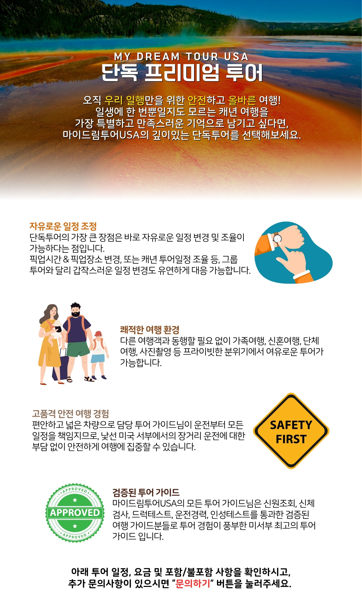 세계에서 가장 큰 규모의 국립공원이자, 1872년 미국 최고의 국립공원으로 지정된 모든 사람들이 가장 가보고 싶어하는 관광지인 옐로스톤 국립공원과 신의 정원이라 불리는 미국 3대 캐년중 하나인 자이언 캐년 그리고 2002년 동계 올림픽 개최지와 몰몬교의 성지로 잘 알려진 솔트레잌 관광과 유황 온천 즐기기 그리고미국의 알프스라고 불리어지는 그랜드티턴 국립공원을 둘러보는 마이드림투어만의 환상의 투어 입니다.