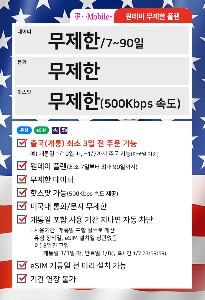 [미국유심 / eSIM] T-MOBILE 5G 속도 지원 미국내 통화 무제한 7일~20일권 평점 4.0816326530612 · 리뷰 49건 포함 상품 설명을 참고해주세요. 불포함 상품 설명을 참고해주세요. 마이리얼트립에서 예약하기 시애틀 목록 도시 목록