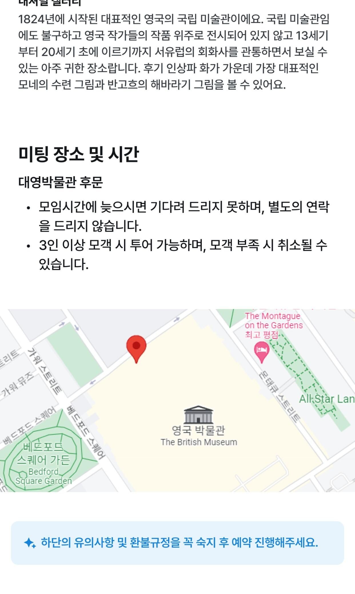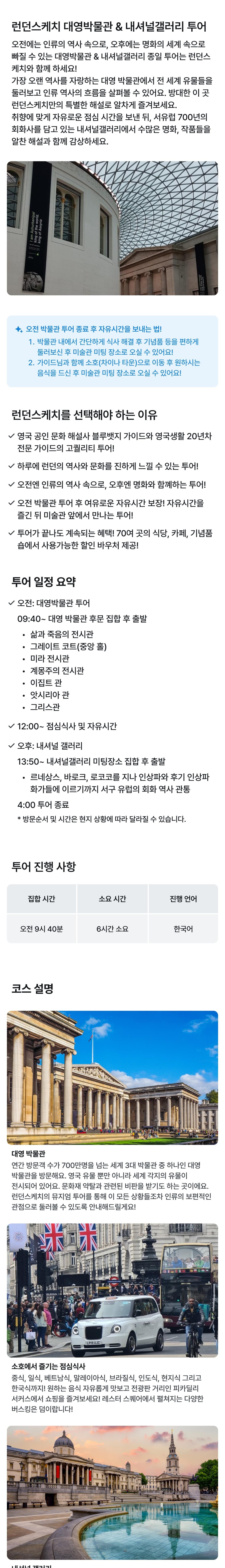 [그룹투어] 오전 대영박물관 뽀개기 & 오후 내셔널갤러리 뽀개기 평점 5 · 리뷰 96건 포함 가이드 비용 불포함 * 수신기 이용료 5파운드 (투어 당일 가이드님께 현금 결재) * 이어폰 대여료 1파운드 (투어 당일 가이드님께 현금 결재) (개인 이어폰 없으신 분들에게만 해당, 필요하신 분은 미리 알려주세요.) * 점심 식사비(1인당 약 2만원) * 영국 박물관과 내셔널 갤러리의 입장은 무료입니다. 마이리얼트립에서 예약하기 런던 목록 도시 목록