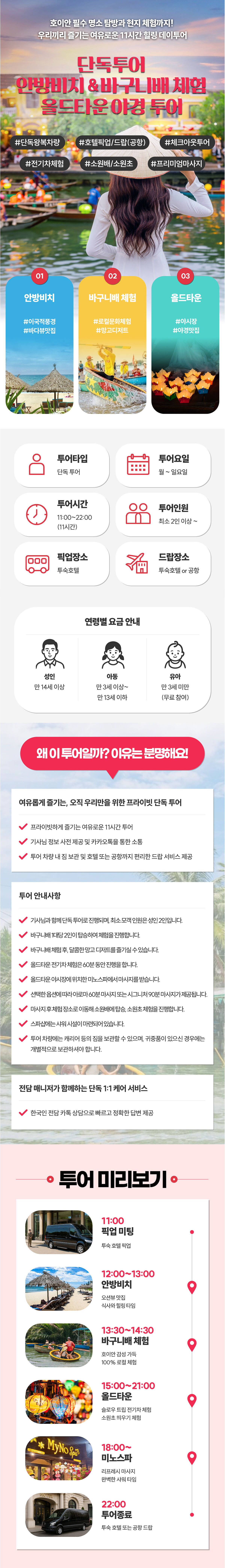- 1. 기사님 팁 5~10만동 권장 / 필수아님 2. 바구니배 뱃사공 팁 2만동(배당기준) 3. 올드타운 입장권 4. 60분/90분 마사지(아동) 5. 저녁식사 6. 개인경비 7. 여행자보험