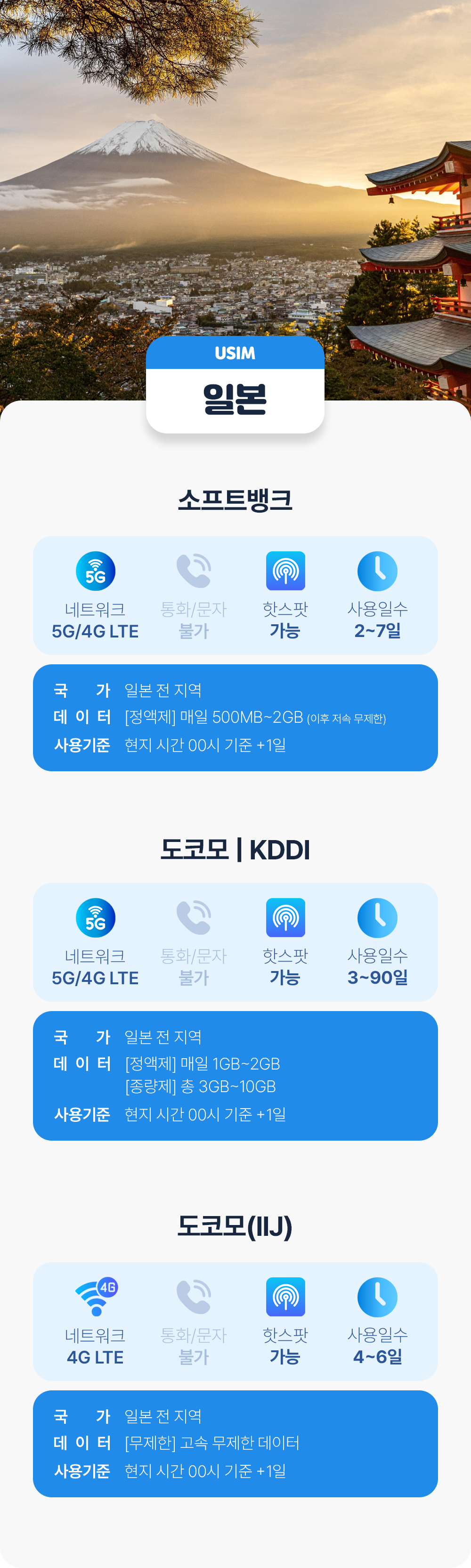 일본유심 5G 무제한 데이터 소프트뱅크 도코모 KDDI 유심칩 인천 김해 공항 수령 가능 평점 3.5 · 리뷰 16건 포함 유심 + 유심케이스 + 유심핀 + 사용설명서 불포함 없음 마이리얼트립에서 예약하기 김해 목록 도시 목록