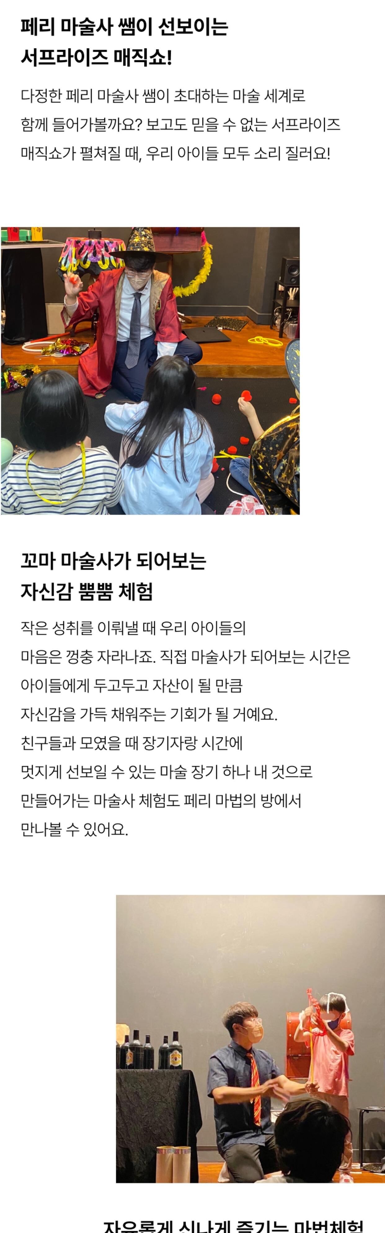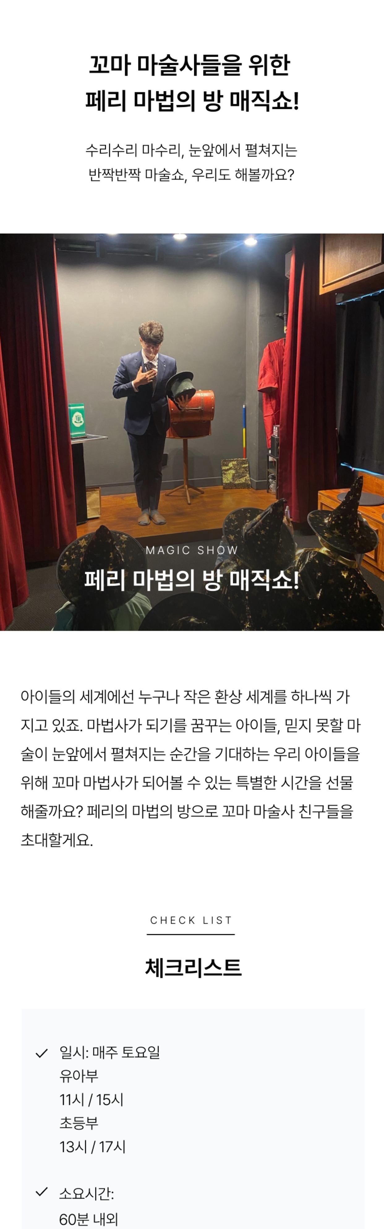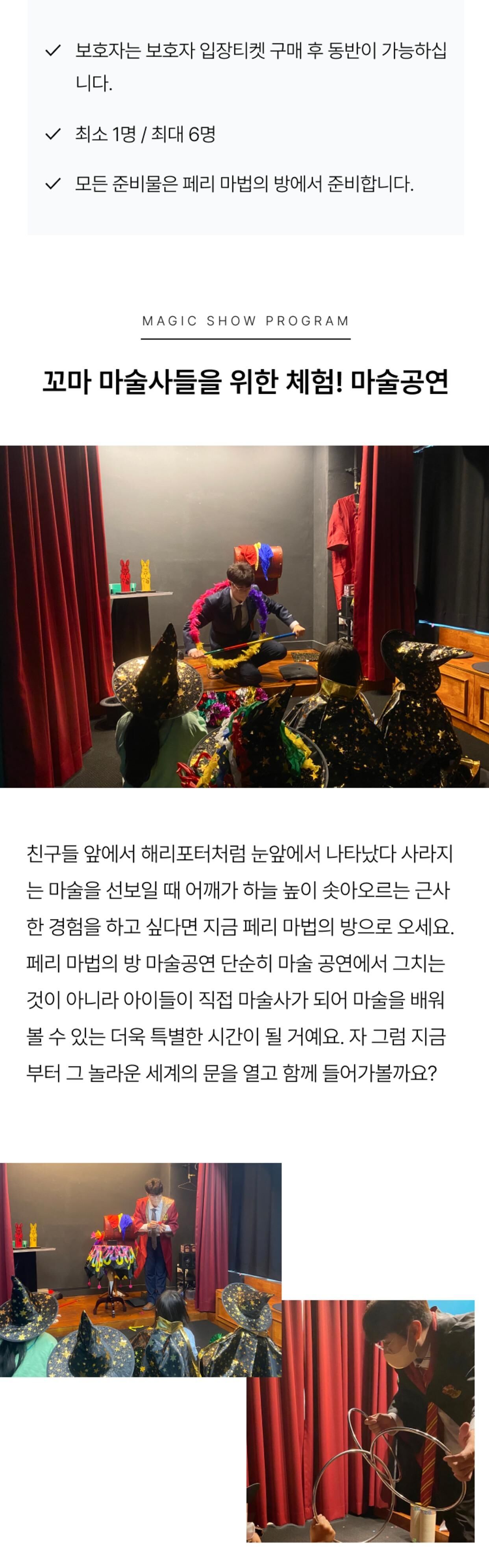 [키즈][경기/김포] 페리 마법의 방 마술공연&마술도구 선물 [5세~11세] 15:30티켓 본문: 로컬 DB 동기화 상세 평점 4.7 · 리뷰 3건 포함 - 클래스 재료비 - 마술사 체험 프로그램 -마술도구 불포함 - 보호자 입장권 1인당 2,000원 - 기타 개인 경비 마이리얼트립에서 예약하기 김포 목록 도시 목록