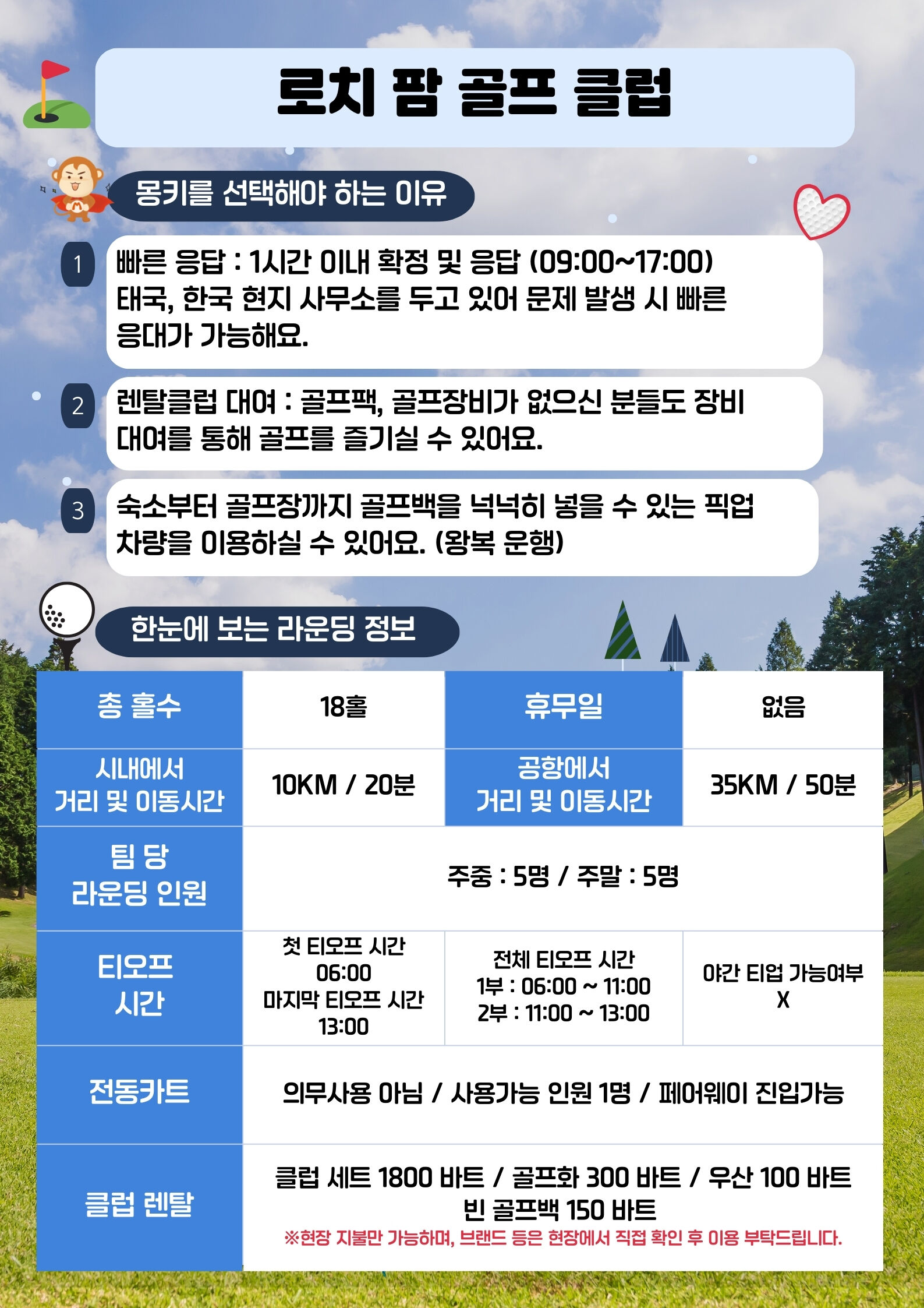 🏌️장비 대여 - 클럽 세트 : 1800 바트 - 바트 골프화 : 300 바트 - 우산 : 100 바트 - 빈 골프백 : 150 바트 *가격의 변동이 있을 수 있어요.