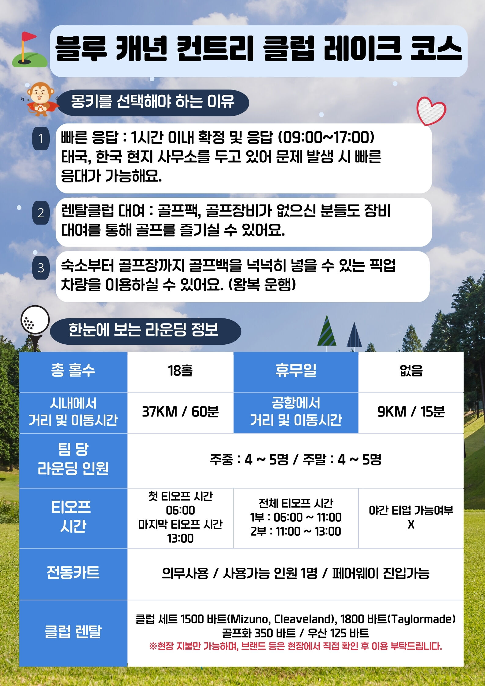 ⛳ 코스 정보 - 홀에 워터 해저드가 있어 시각적으로 아름다우면서도 도전적인 코스예요. - 전체적으로 페어웨이가 길고 좁으며 빠른 그린과 전략적인 벙커 배치가 돋보여요. - 편안하고 즐거운 라운딩을 제공하며, 잘 관리된 페어웨이와 고요한 호수가 어우러져 아름다운 자연 경관 속에서 플레이할 수 있어요.