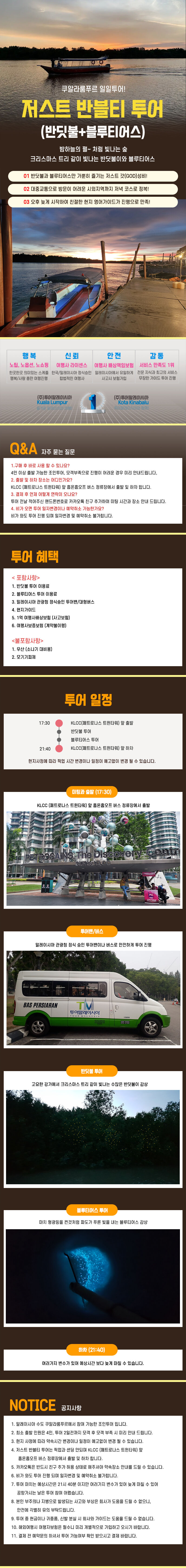 - - 반딧불 투어 이용료 - 블루티어스 투어 이용료 - 말레이시아 관광청 정식승인 투어밴/대형버스 - 현지 영어 가이드(성수기에는 한국인 가이드가 함께 보트 탑승합니다.) - 1억 여행사배상보험 (사고보험) - 여행사보증보험 (계약불이행)