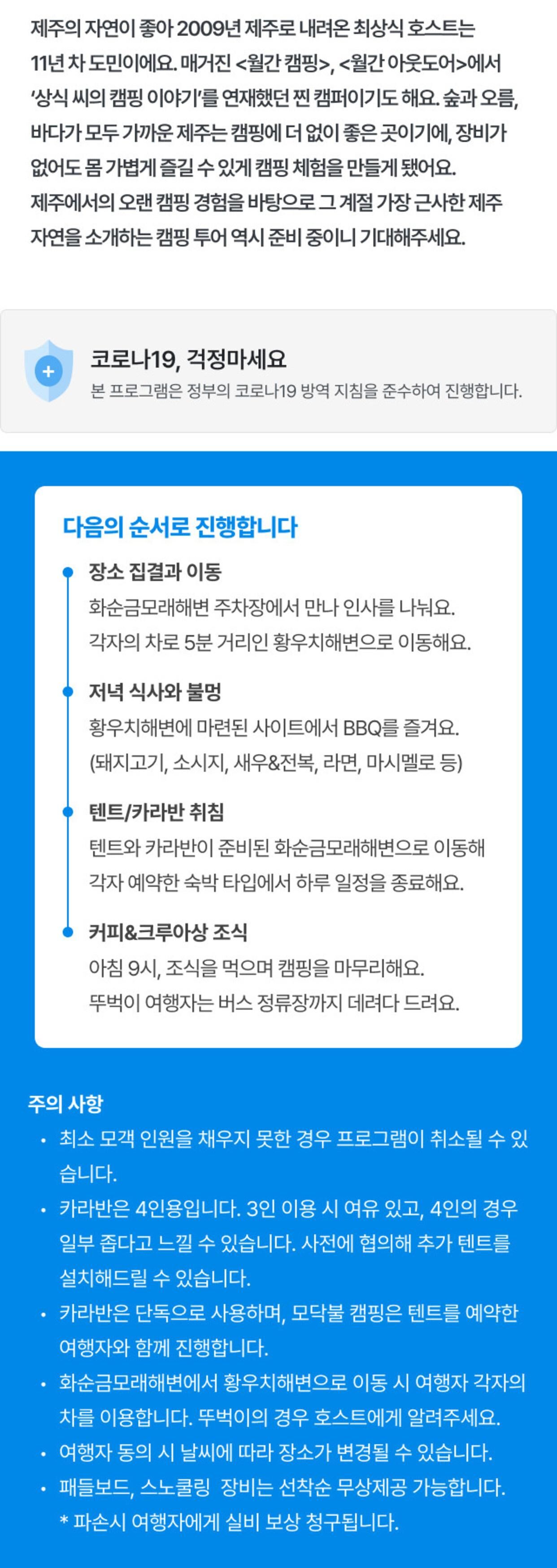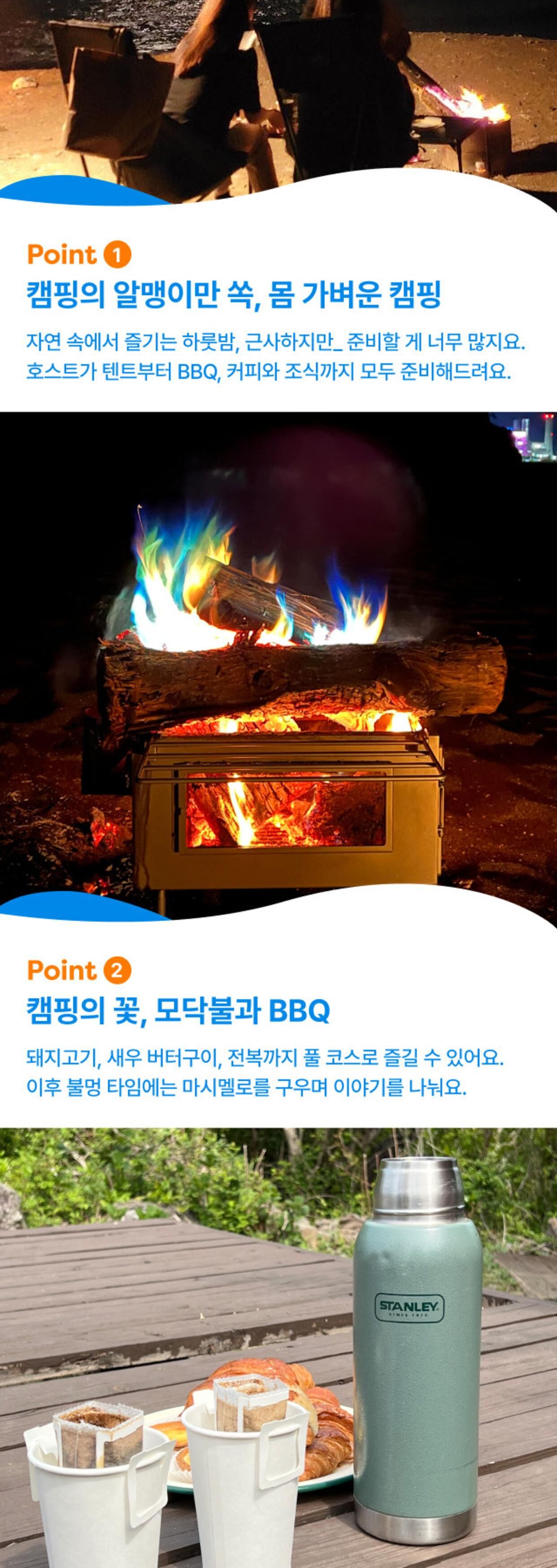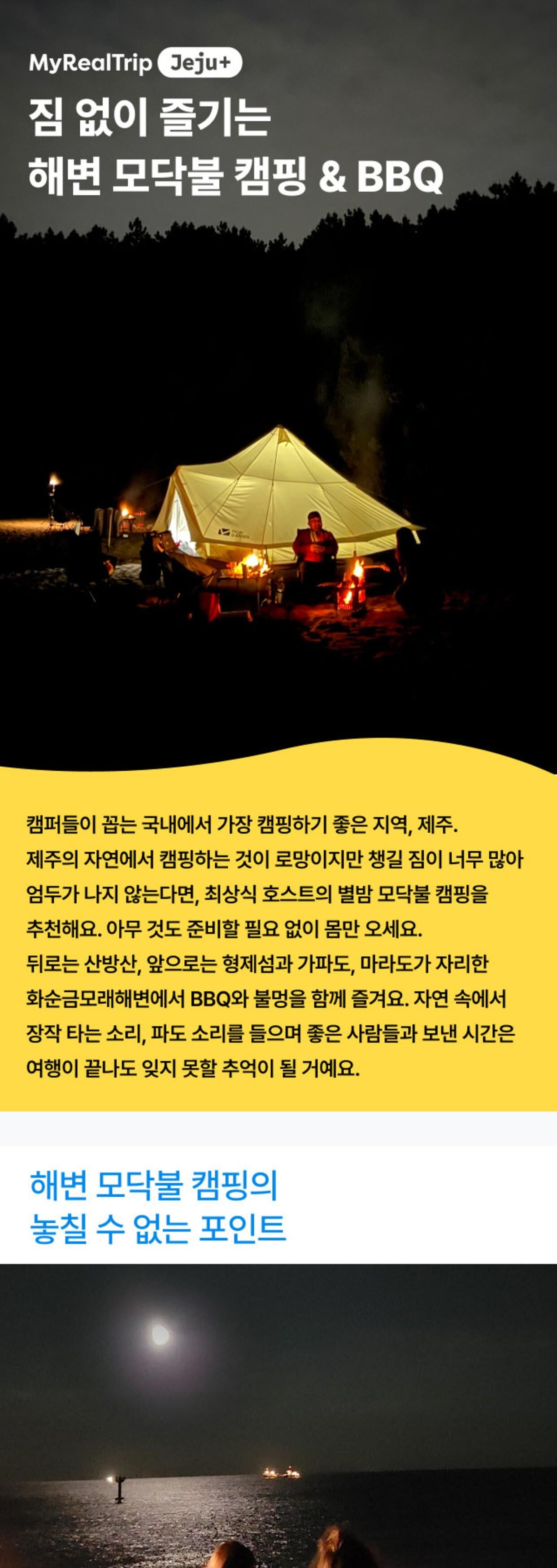 [안덕] 짐 없이 즐기는 해변 모닥불 캠핑&BBQ 평점 4.9677419354839 · 리뷰 62건 포함 - 식사 저녁 - 돼지고기,수제소시지,새우버터구이,전복버터구이,라면,마시멜로 아침 - 바다 코스: 핸드드립커피 & 크로아상 산 코스: 동일 함 - 동계 침남 제공 불포함 - 주류 마이리얼트립에서 예약하기 서귀포 목록 도시 목록