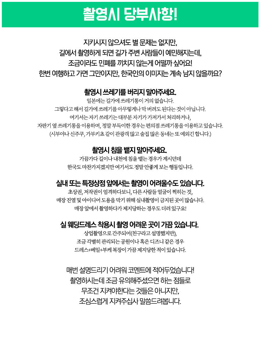 * 사진에 나오지 않아야할, 불필요한 백팩이나 짐은 없이 와주세요! 계속 이동하면서 촬영하고 있어, 길에다 짐을 놓으면서 촬영할 수 없으니 꼭 부탁드립니다!