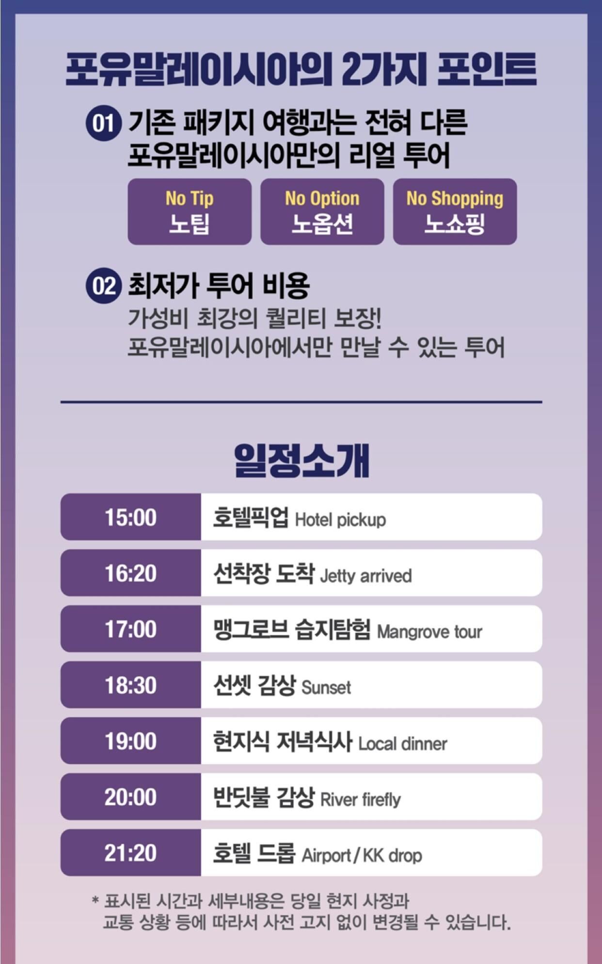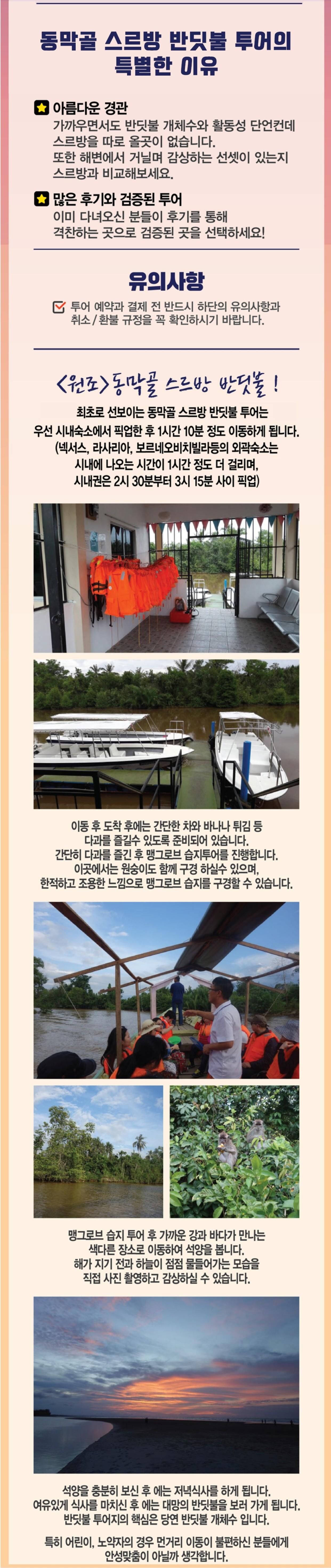 코타키나발루 동막골 스르방 반딧불 투어 (여행자보험/노팁/시내픽업/식사) 평점 5 · 리뷰 2건 포함 시내 호텔 픽업 (시외 지역은 별도 옵션 구매) 반딧불 보트 이용료 저녁 식사 여행자보험 (투어일 포함 2일로 신청자에 한함) **투어 당일 적용되는 보험으로 개별 여행자 보험은 따로 진행해 주셔야 합니다. 불포함 개인 경비 마이리얼트립에서 예약하기 코타키나발루 목록 도시 목록