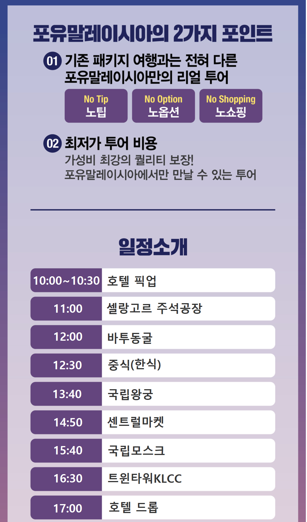 국립모스크, 국립왕궁, 주석공장, 바투동굴 등 쿠알라룸푸르의 명소를 편안하게 하루에 보실 수 있습니다.