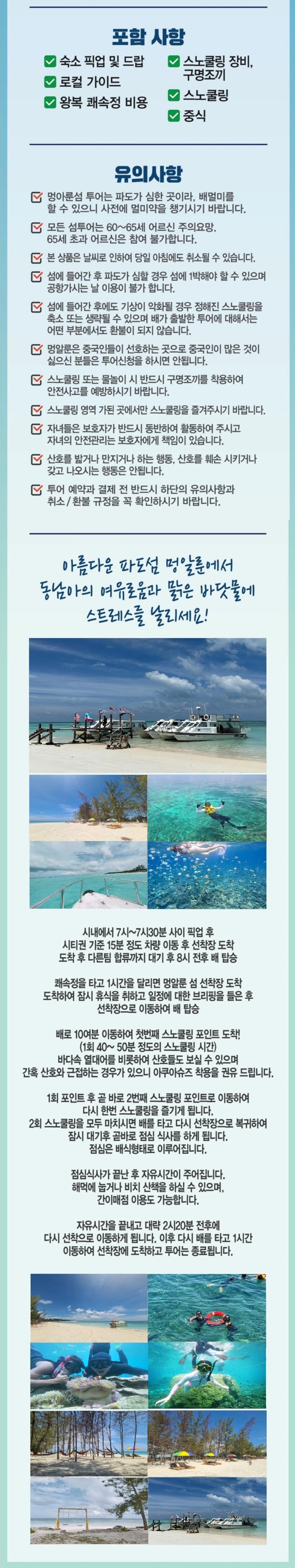 코타키나발루의 숨은 진주 멍알룬 섬투어! 에메랄드 바다에서 즐기는 스노클링 (여행자보험) 포함 시내 호텔 픽업 (시외 지역은 별도 옵션 구매) 보트 이용료 스노클링용 물안경 구명조끼 현지식 점심식사 여행자보험 (투어일 포함 2일로 신청자에 한함) **투어 당일 적용되는 보험으로 개별 여행자 보험은 따로 진행해 주셔야 합니다. 불포함 개인경비 아쿠아슈즈(아쿠아슈즈 착용을 권장합니다) 여벌옷과 비치타올 개별 여행자 보험 시외 지역 픽업 비용 마이리얼트립에서 예약하기 진주 목록 도시 목록