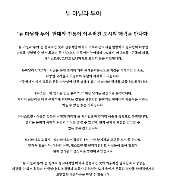 - 투어가이드 불포함 곤돌라 체험 비용 :500페소 정도 개인 지출비용 / 기념품 구매 매너 팁 개별 여행자 보험