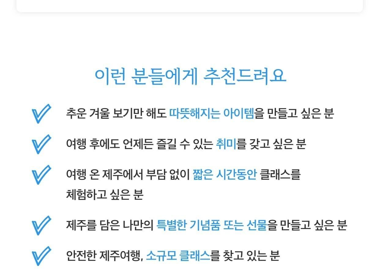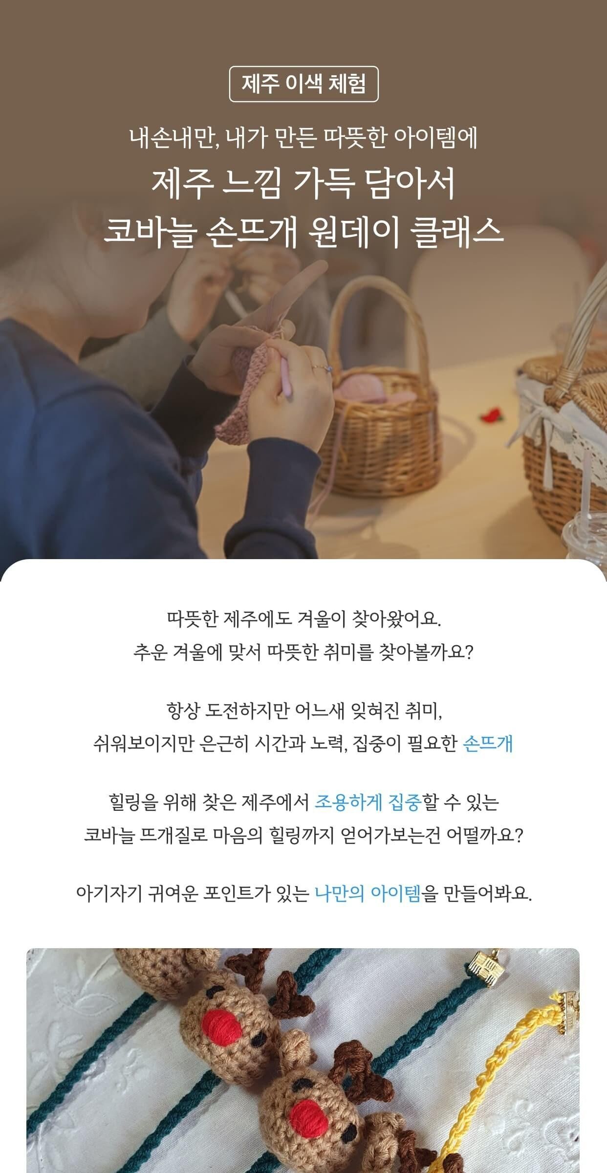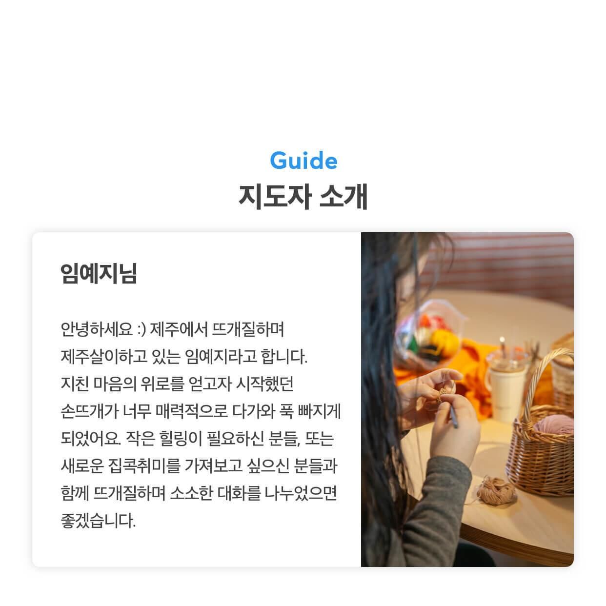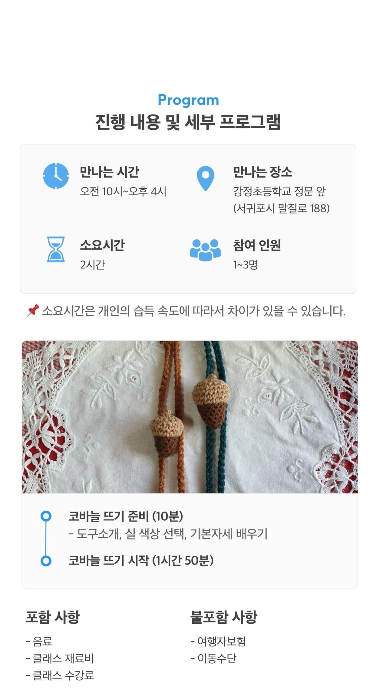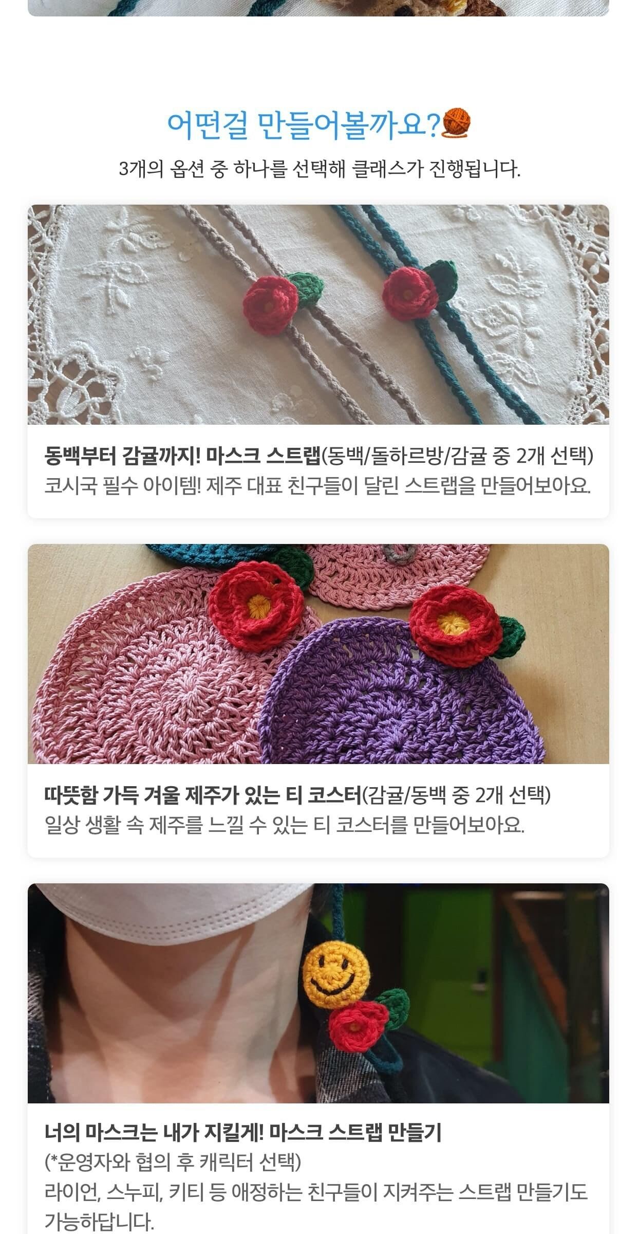 (서귀포) 제주를 담은 코바늘 손뜨개, 프라이빗 원데이 클래스 평점 5 · 리뷰 8건 포함 음료 클래스 재료비 - 제주 담은 마스크 스트랩 만들기 클래스 : 마스크 스트랩 2개 - 티 코스터 만들기 클래스 : 티 코스터 2개 - 캐릭터 마스크 스트랩 만들기 클래스 : 마스크 스트랩 1개 클래스 수강료 불포함 여행자 보험 이동 수단 마이리얼트립에서 예약하기 서귀포 목록 도시 목록