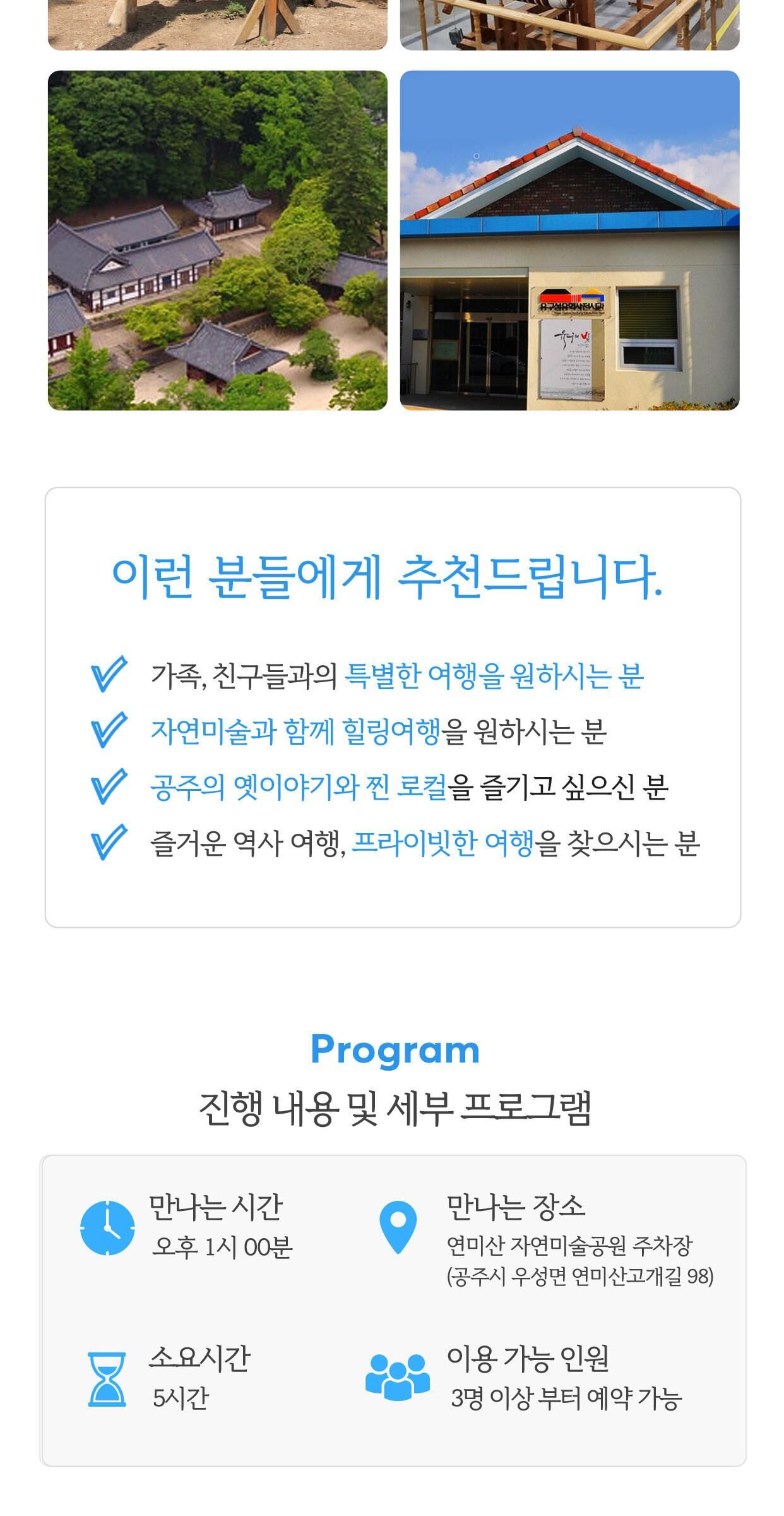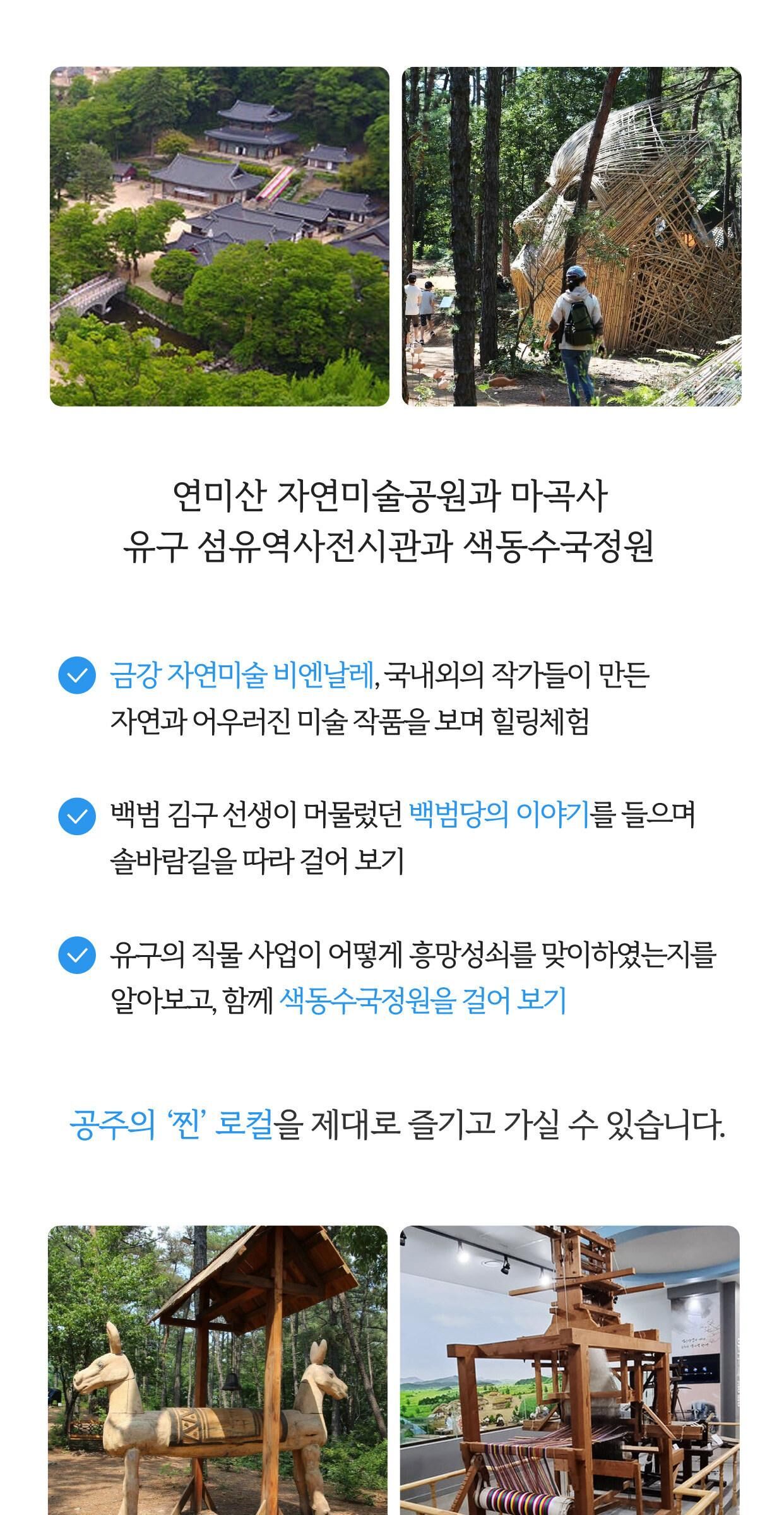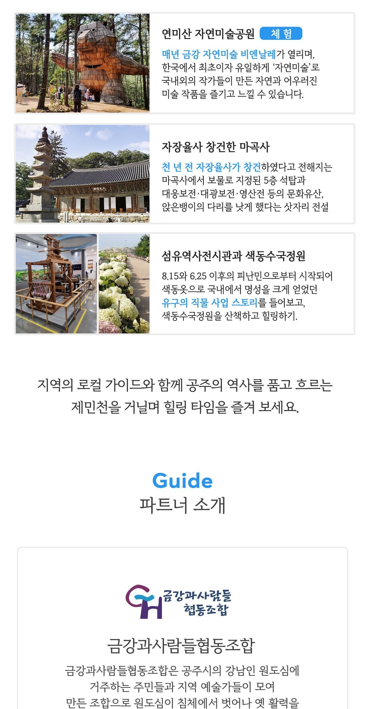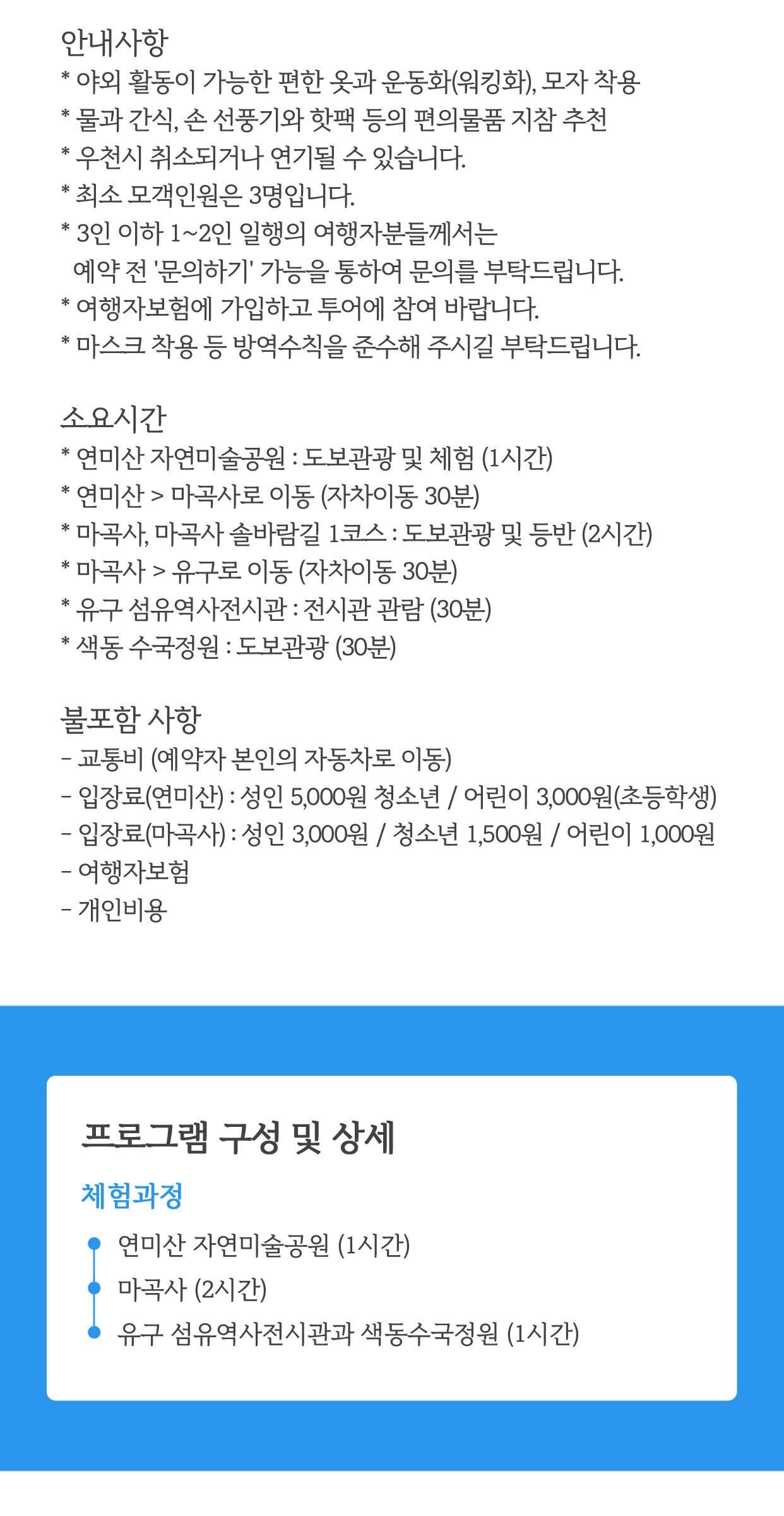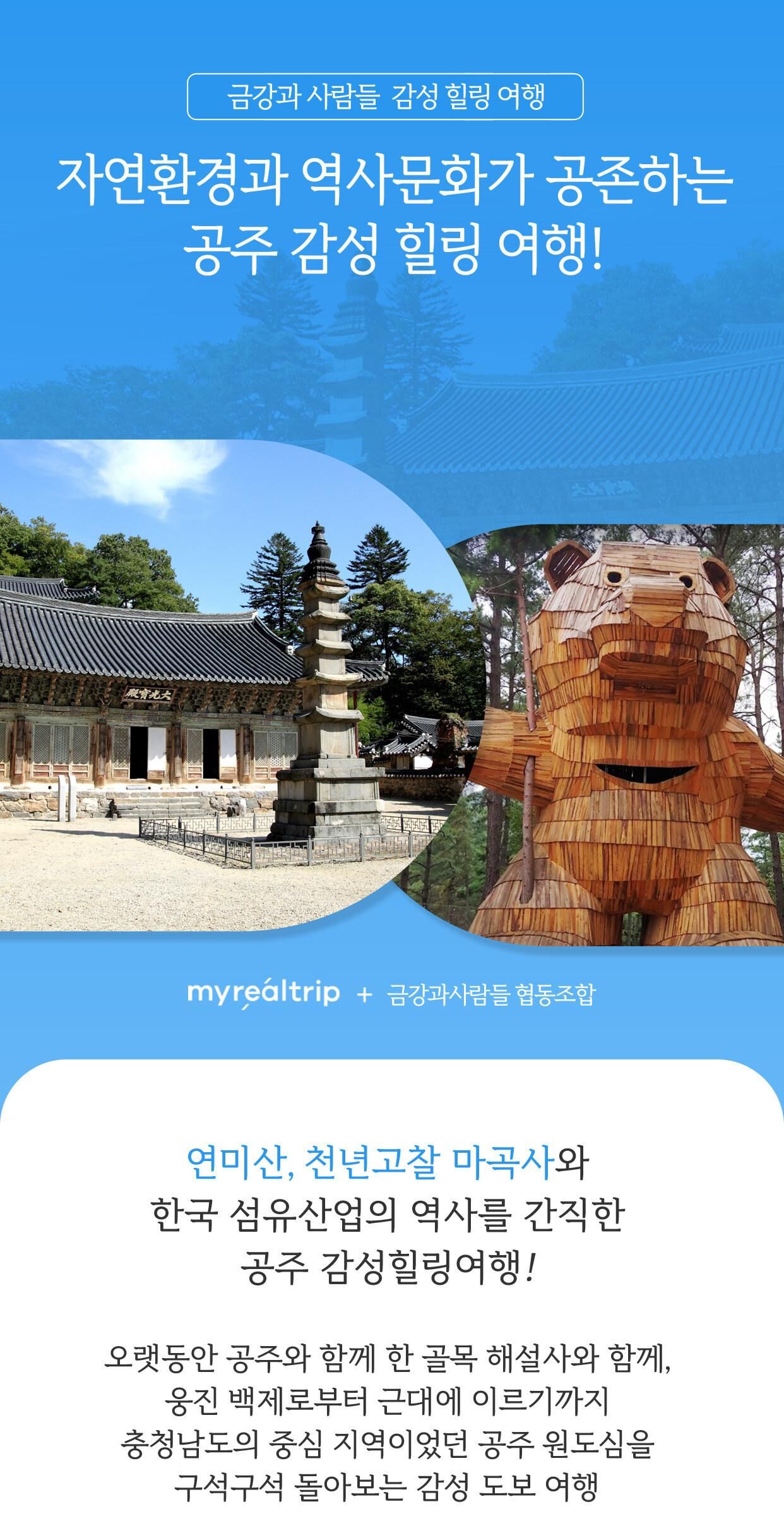 (반나절) 자연환경과 역사문화가 공존하는 공주 감성 힐링 여행! [충남/공주] 포함 - 가이드비용 불포함 - 교통비 (예약자 본인의 자동차로 이동) - 입장료(연미산) : 성인 5,000원 청소년 / 어린이 3,000원 - 입장료(마곡사) : 성인 3,000원 / 청소년 1,500원 / 어린이(초등학생) 1,000원 - 여행자보험 - 개인비용 마이리얼트립에서 예약하기 공주 목록 도시 목록