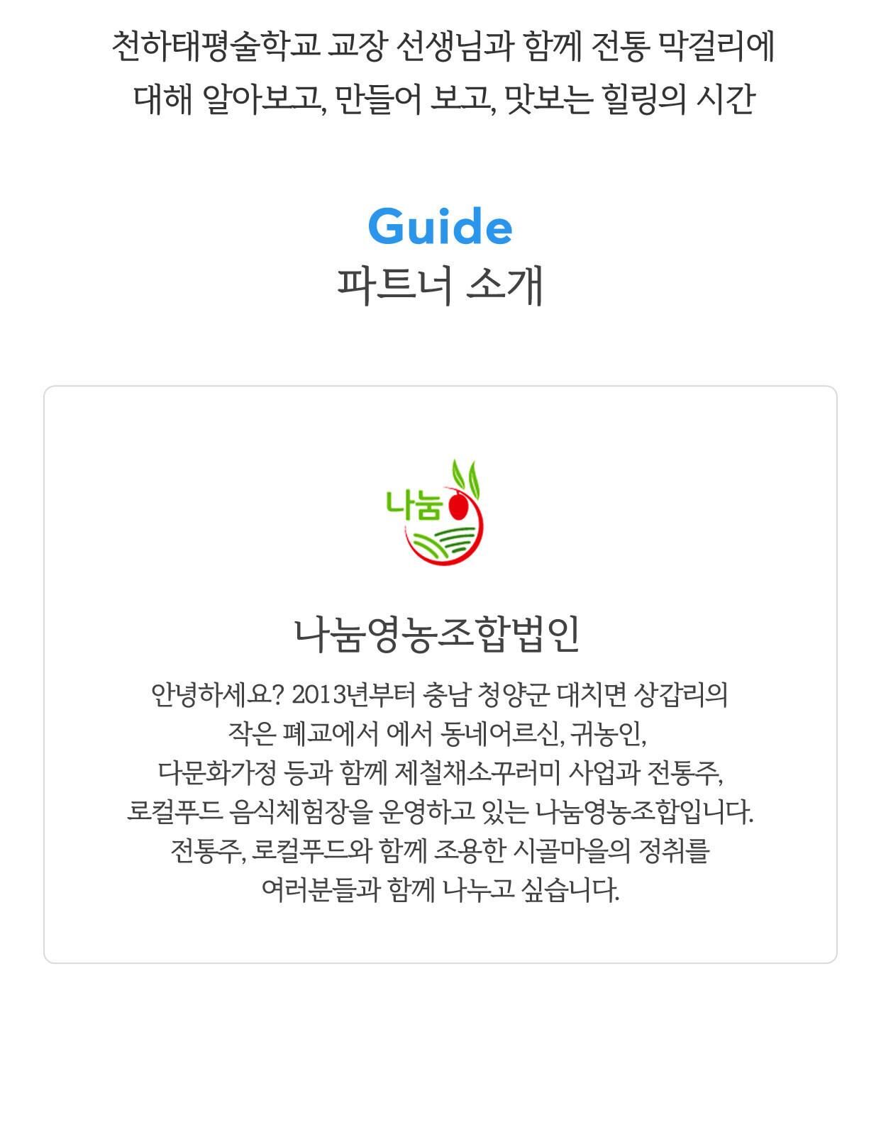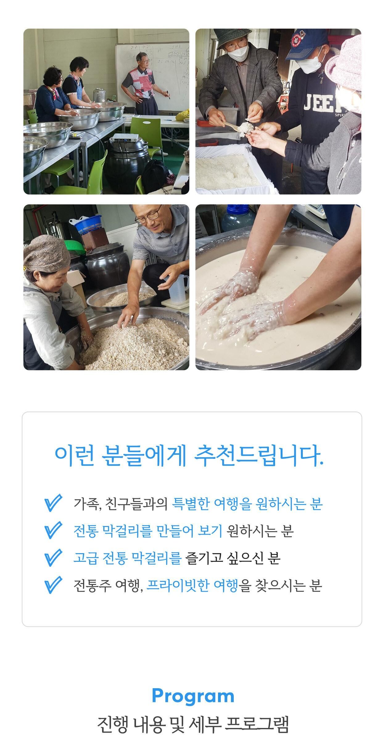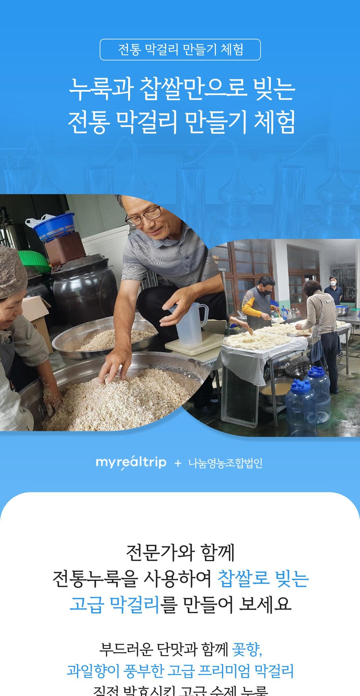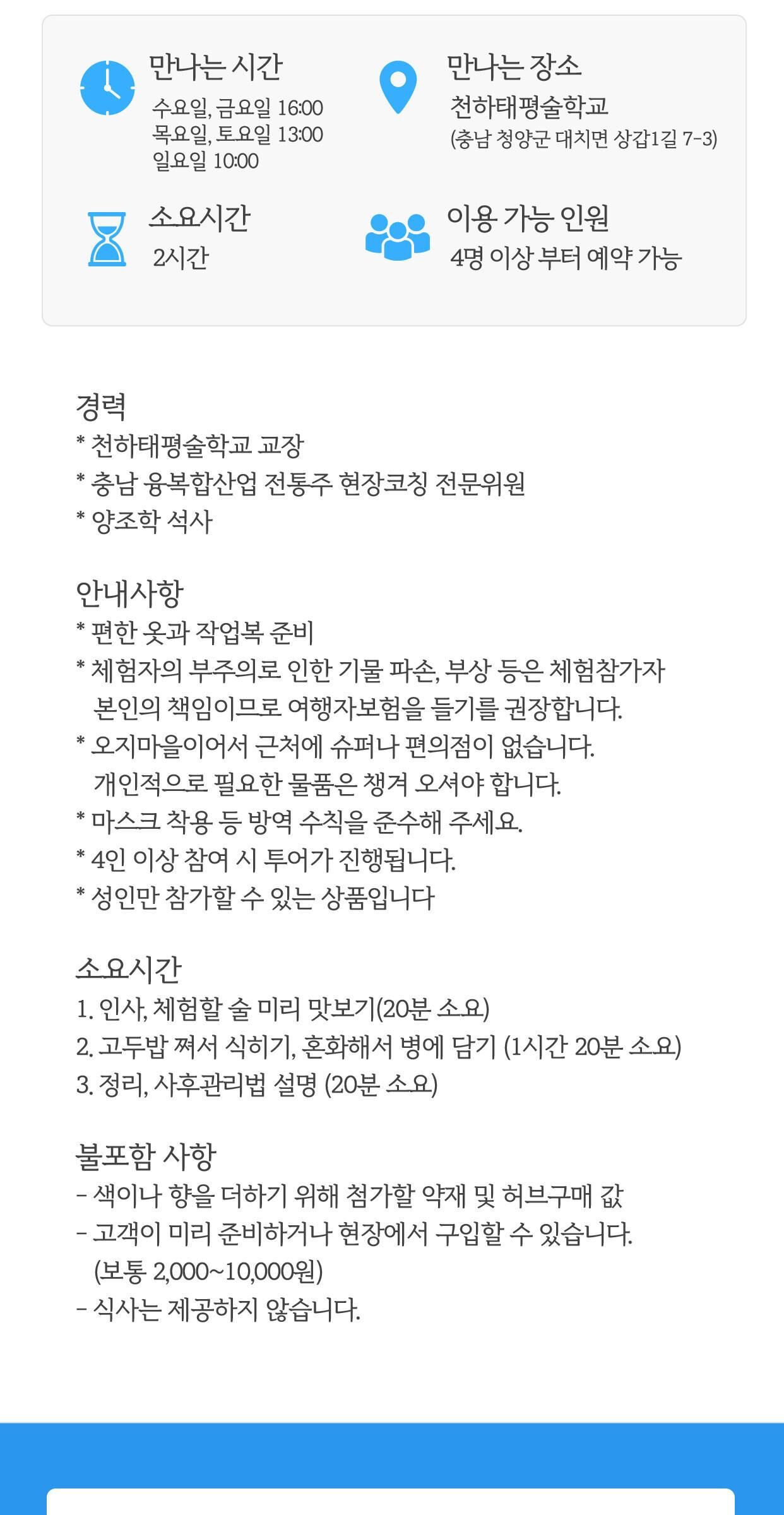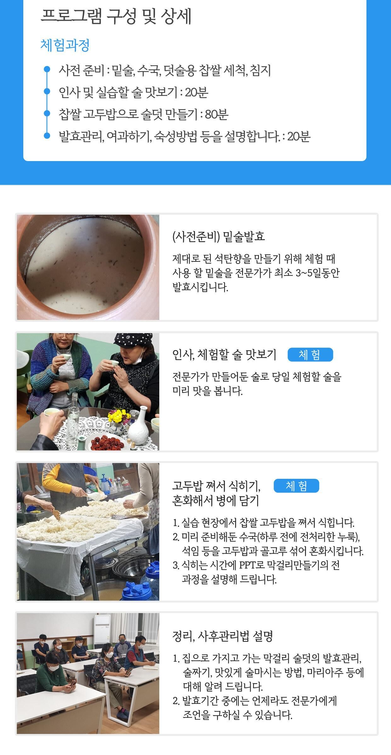 누룩과 찹쌀만으로 빚는 전통 막걸리 만들기 체험 [충남/청양] 본문: 로컬 DB 동기화 상세 포함 - 재료비 - 진행비 - 강사료 - 발효용 페트병 - 막걸리 5L 불포함 - 색이나 향을 더하기 위해 첨가할 약재 및 허브값. * 고객이 미리 준비하거나 현장에서 구입할 수 있습니다. (보통 2,000~10,000원) - 식사는 제공하지 않습니다. 마이리얼트립에서 예약하기 대전 목록 도시 목록