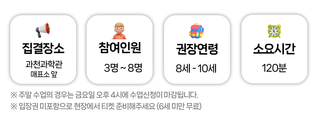 [라라클래스] 놀면서 배우는 과학 원리! 초등 액티브 물리탐험대 - 국립과천과학관 본문: 로컬 DB 동기화 상세 평점 4.9 · 리뷰 9건 포함 *과학체험 수업 *라라클래스 자체제작 교재 *공기대포 키트 불포함 *개인 경비 마이리얼트립에서 예약하기 과천 목록 도시 목록