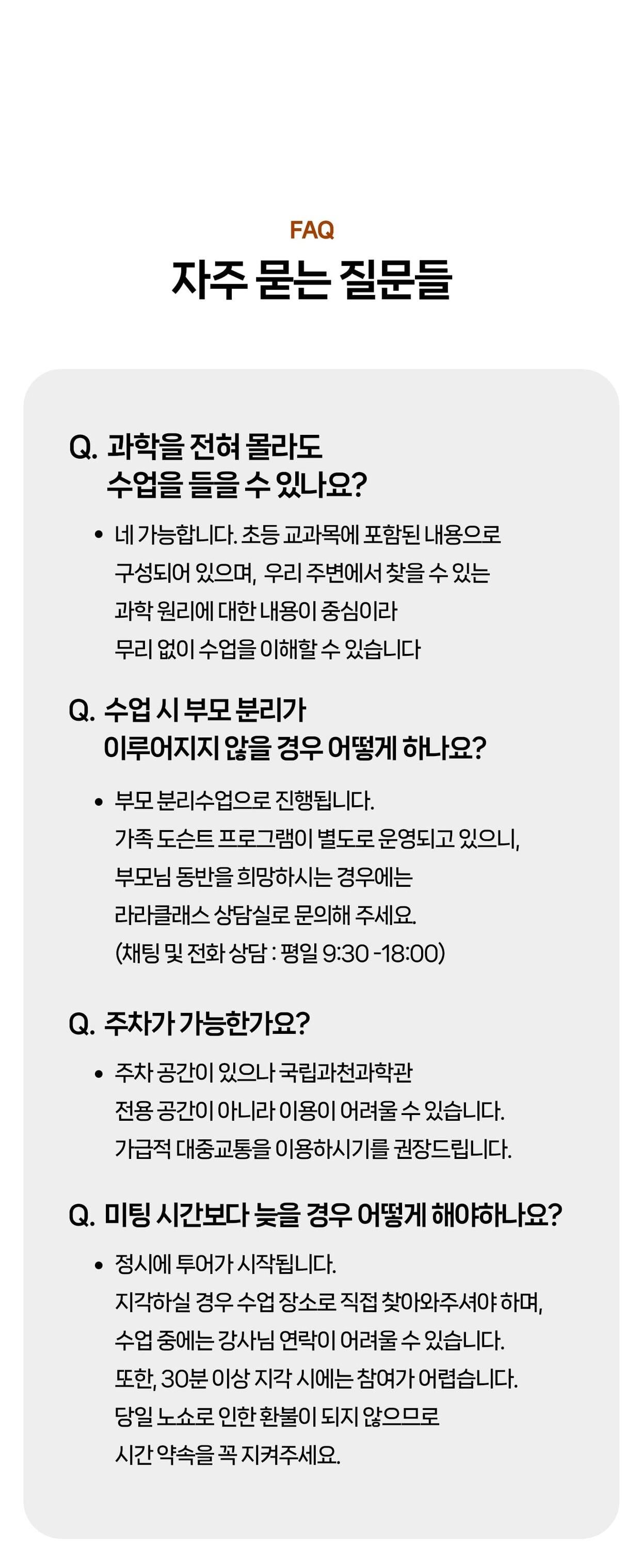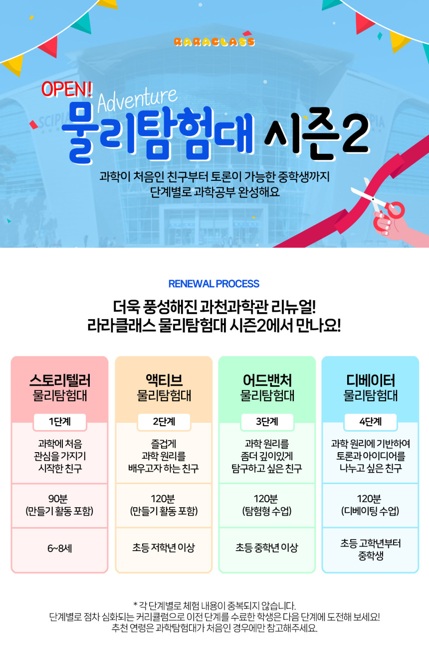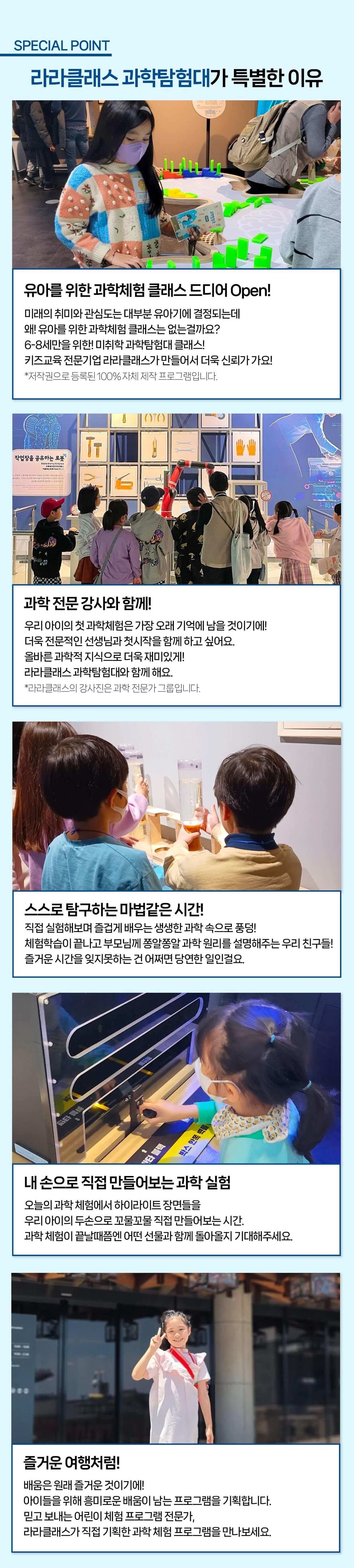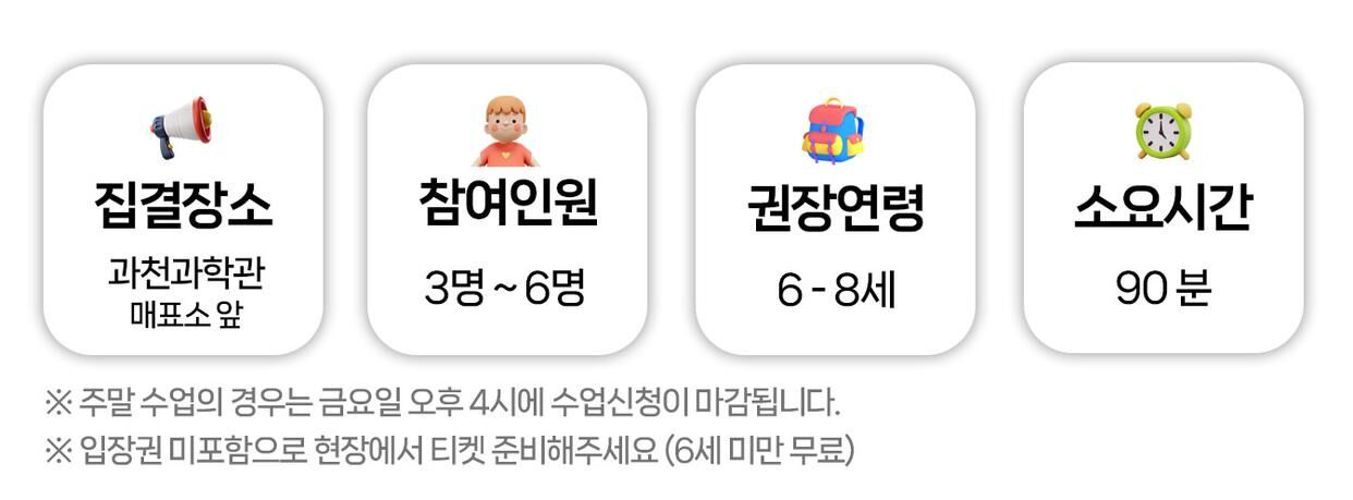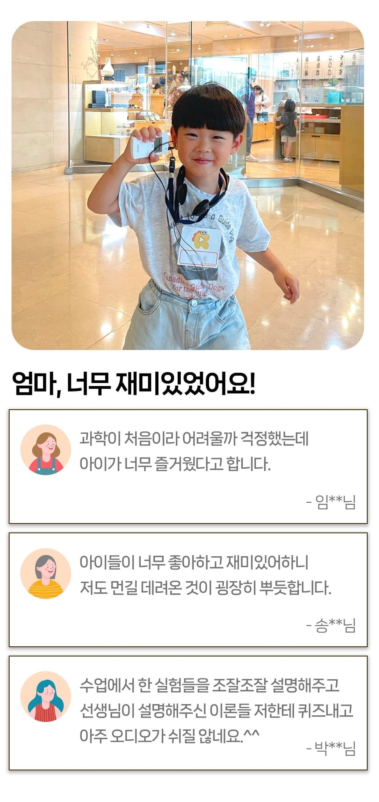 [라라클래스] 놀면서 배우는 과학 원리! 미취학 스토리텔러 물리탐험대 - 국립과천과학관 본문: 로컬 DB 동기화 상세 포함 *특허받은 과학 커리큘럼 *과학 전공 강사와 함께 *미취학 90분 수업 *라라클래스 자체 제작 교재 *공기대포 키트 불포함 *개인 경비 마이리얼트립에서 예약하기 과천 목록 도시 목록