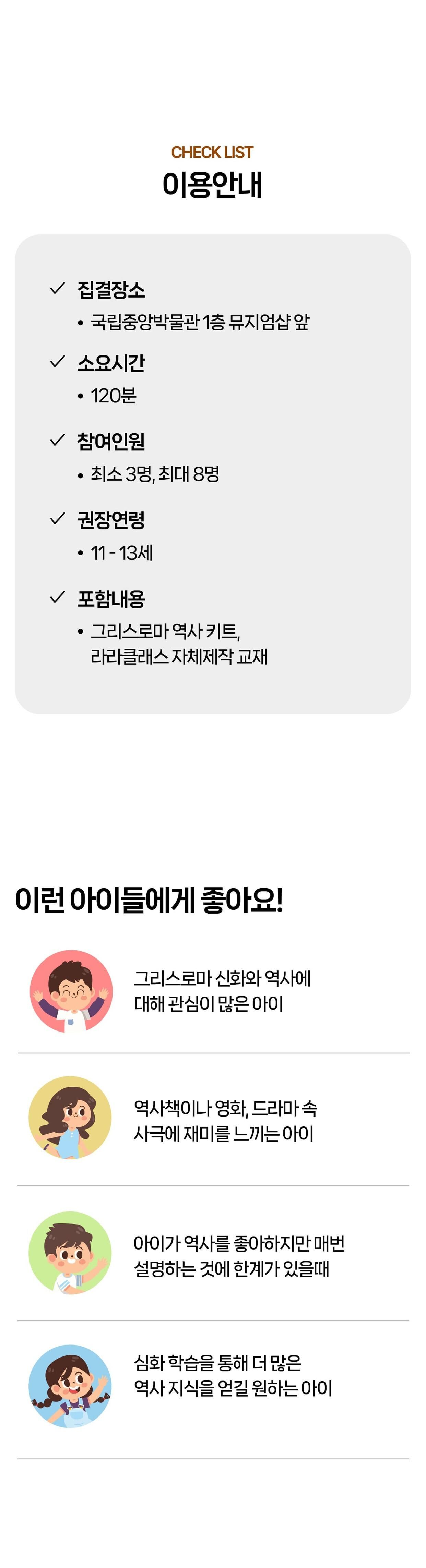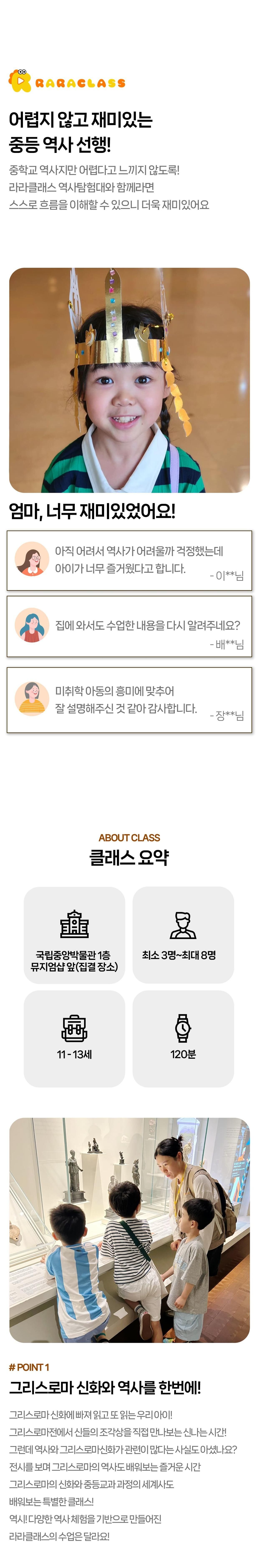 [라라클래스] 고학년 전용! 그리스로마 신화와 세계사를 한번에 - 그리스로마전(11세이상) 본문: 로컬 DB 동기화 상세 평점 5 · 리뷰 1건 포함 * 특허받은 역사 커리큘럼 * 역사 전공 강사와 함께 * 초등 120분 수업 * 라라클래스 자체 제작 교재 * 그리스로마 역사키트 불포함 * 개인 준비물 (끈달린 가방에 연필, 지우개, 마실물 준비해주시면 좋습니다) 마이리얼트립에서 예약하기 서울 목록 도시 목록