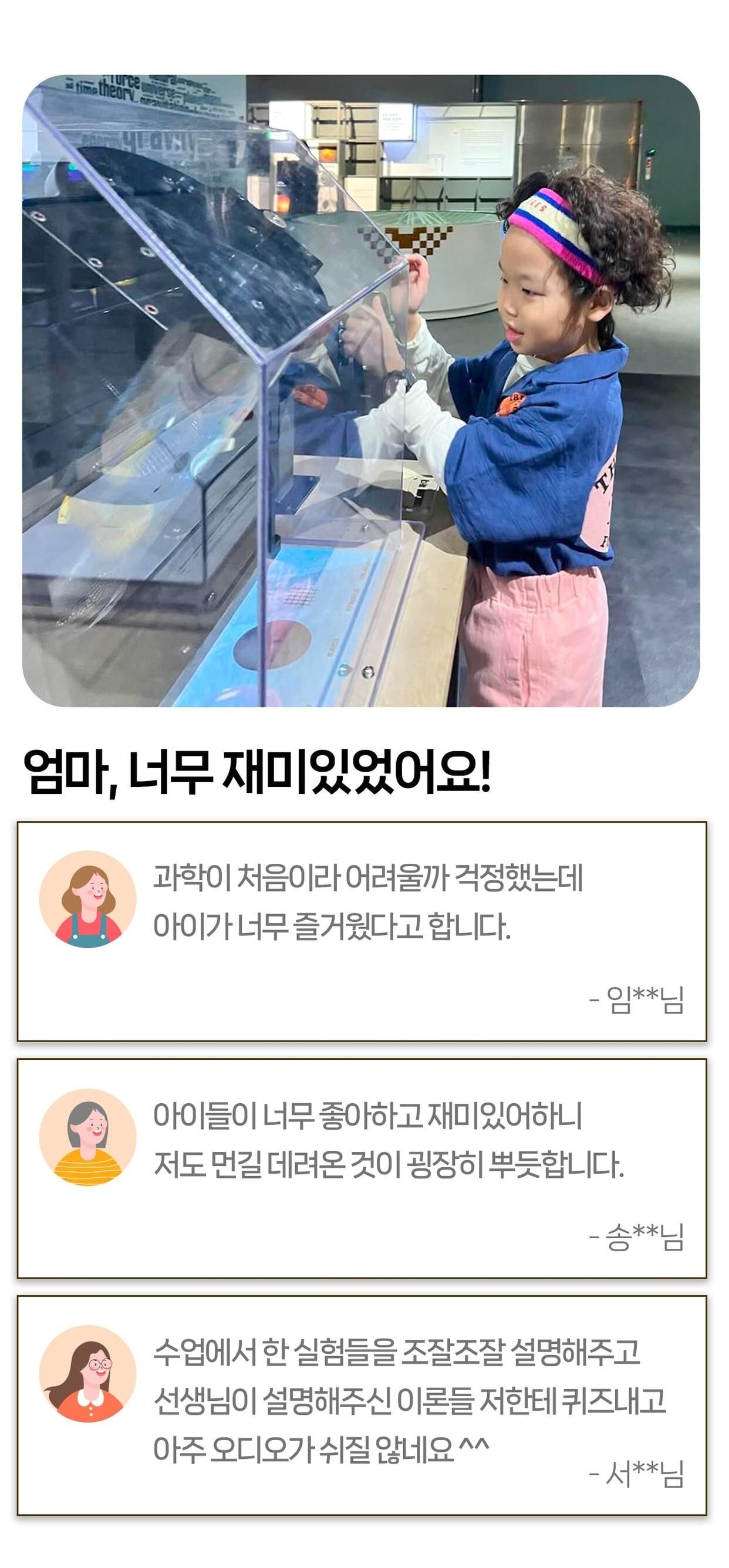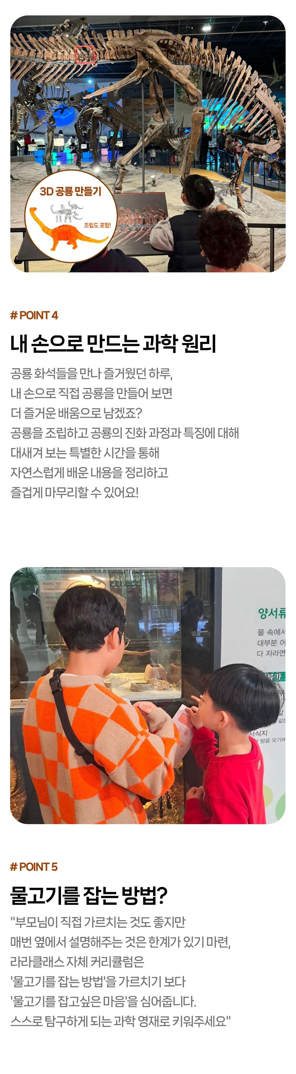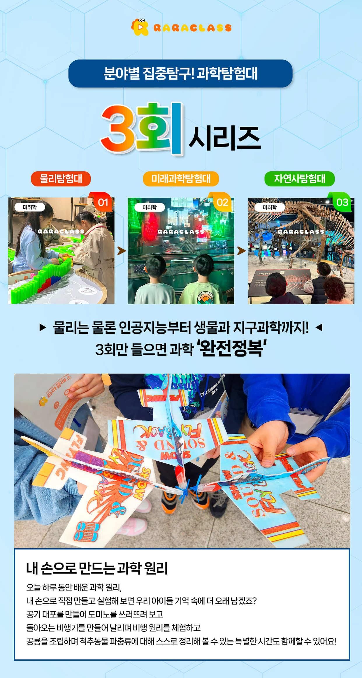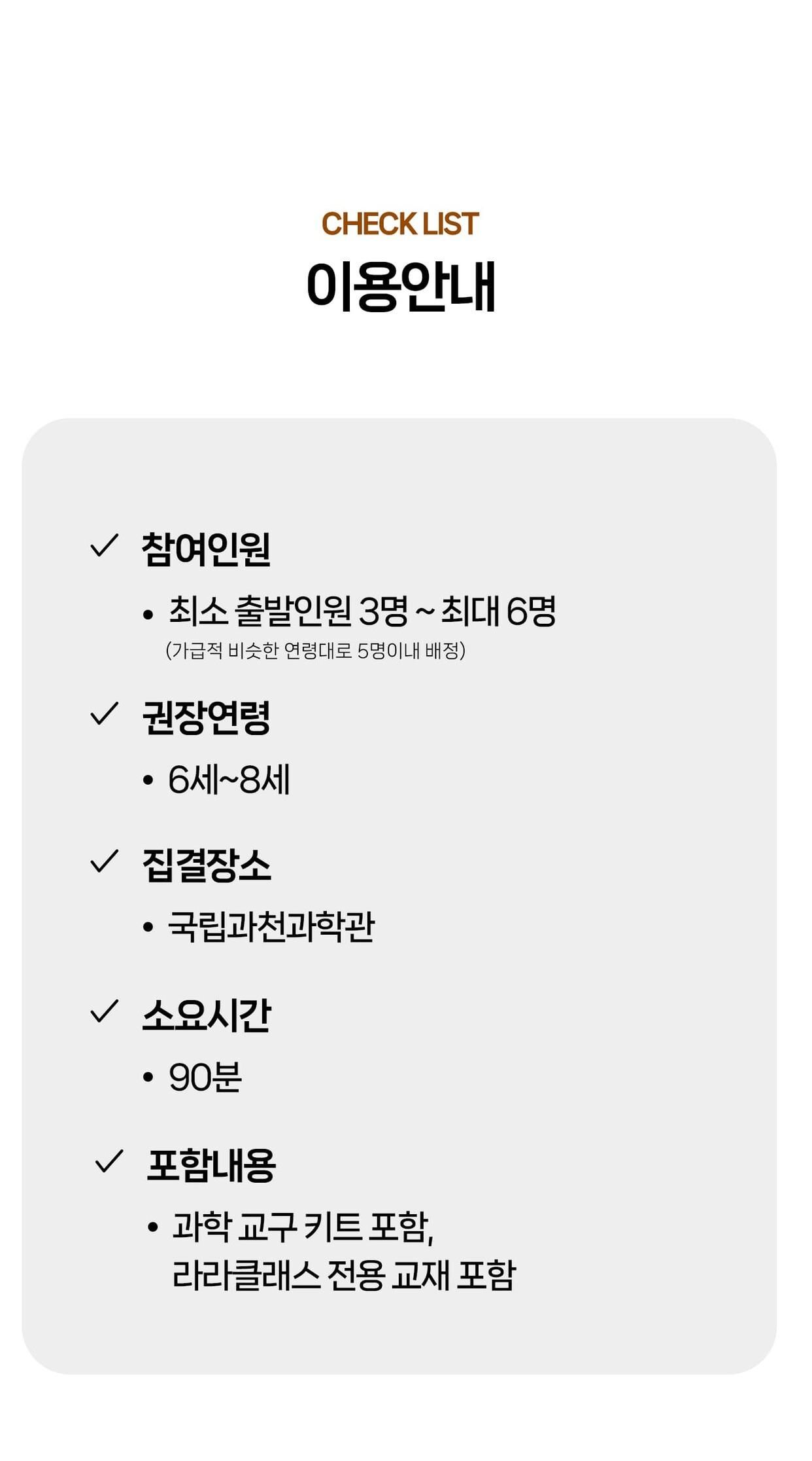 [라라클래스] 놀면서 배우는 과학 원리! 미취학 자연사탐험대 -국립과천과학관 (6-8세) 본문: 로컬 DB 동기화 상세 포함 * 특허받은 과학 커리큘럼 * 과학 전공 강사와 함께 * 미취학 90분 수업 * 라라클래스 자체 제작 교재 * 과학교구 키트 불포함 * 과학관 입장권 (키오스크 개별 구매) * 개인 준비물 (끈달린 가방에 연필, 지우개, 마실 물 준비해주시면 좋습니다) 마이리얼트립에서 예약하기 과천 목록 도시 목록