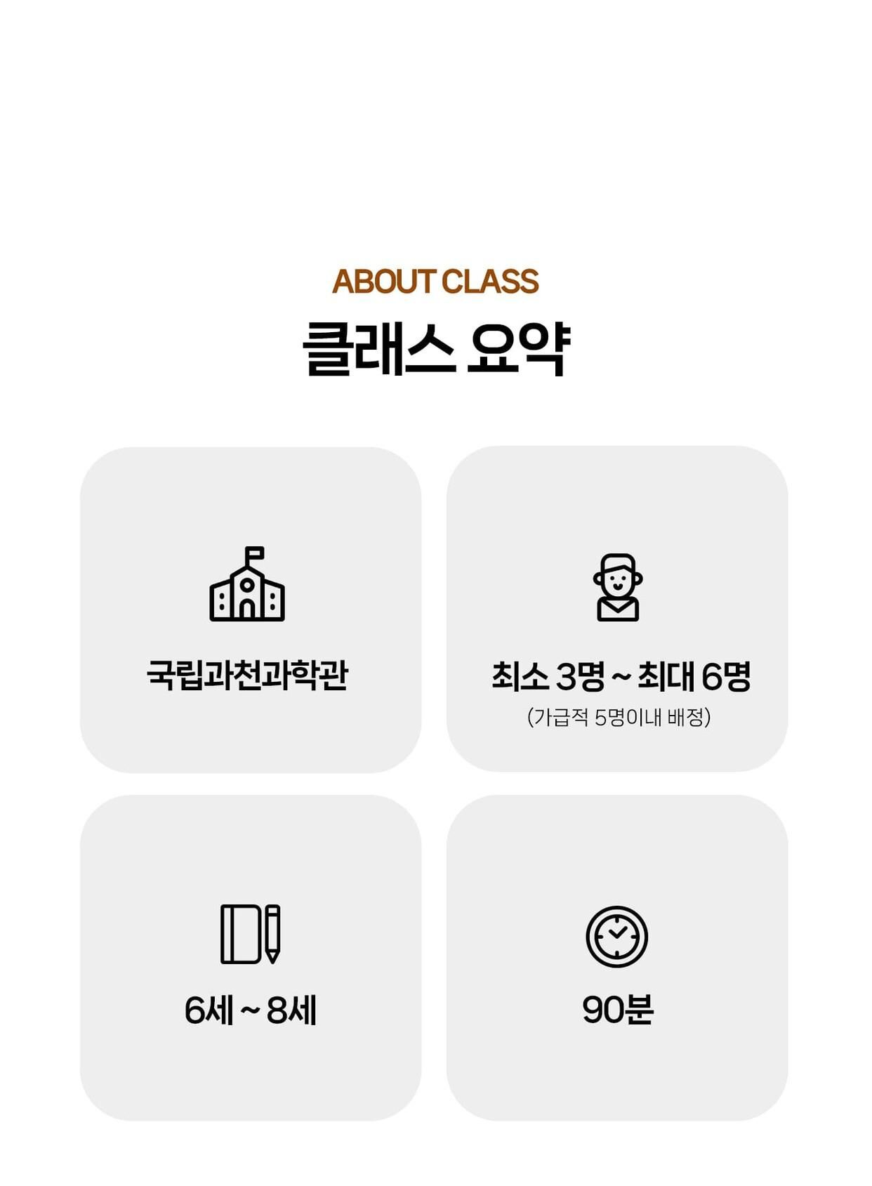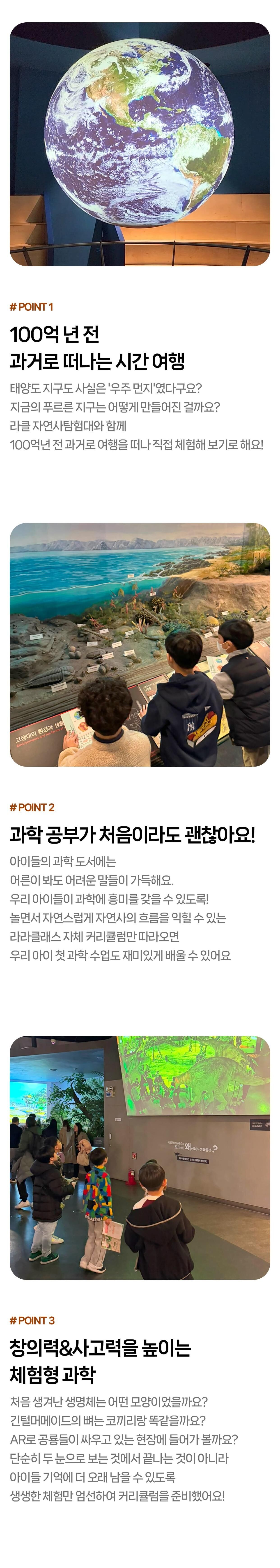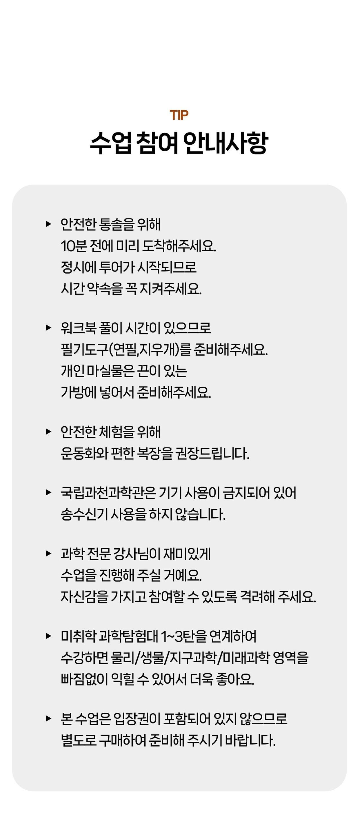 [라라클래스] 놀면서 배우는 과학 원리! 미취학 자연사탐험대 -국립과천과학관 (6-8세) 본문: 로컬 DB 동기화 상세 포함 * 특허받은 과학 커리큘럼 * 과학 전공 강사와 함께 * 미취학 90분 수업 * 라라클래스 자체 제작 교재 * 과학교구 키트 불포함 * 과학관 입장권 (키오스크 개별 구매) * 개인 준비물 (끈달린 가방에 연필, 지우개, 마실 물 준비해주시면 좋습니다) 마이리얼트립에서 예약하기 과천 목록 도시 목록