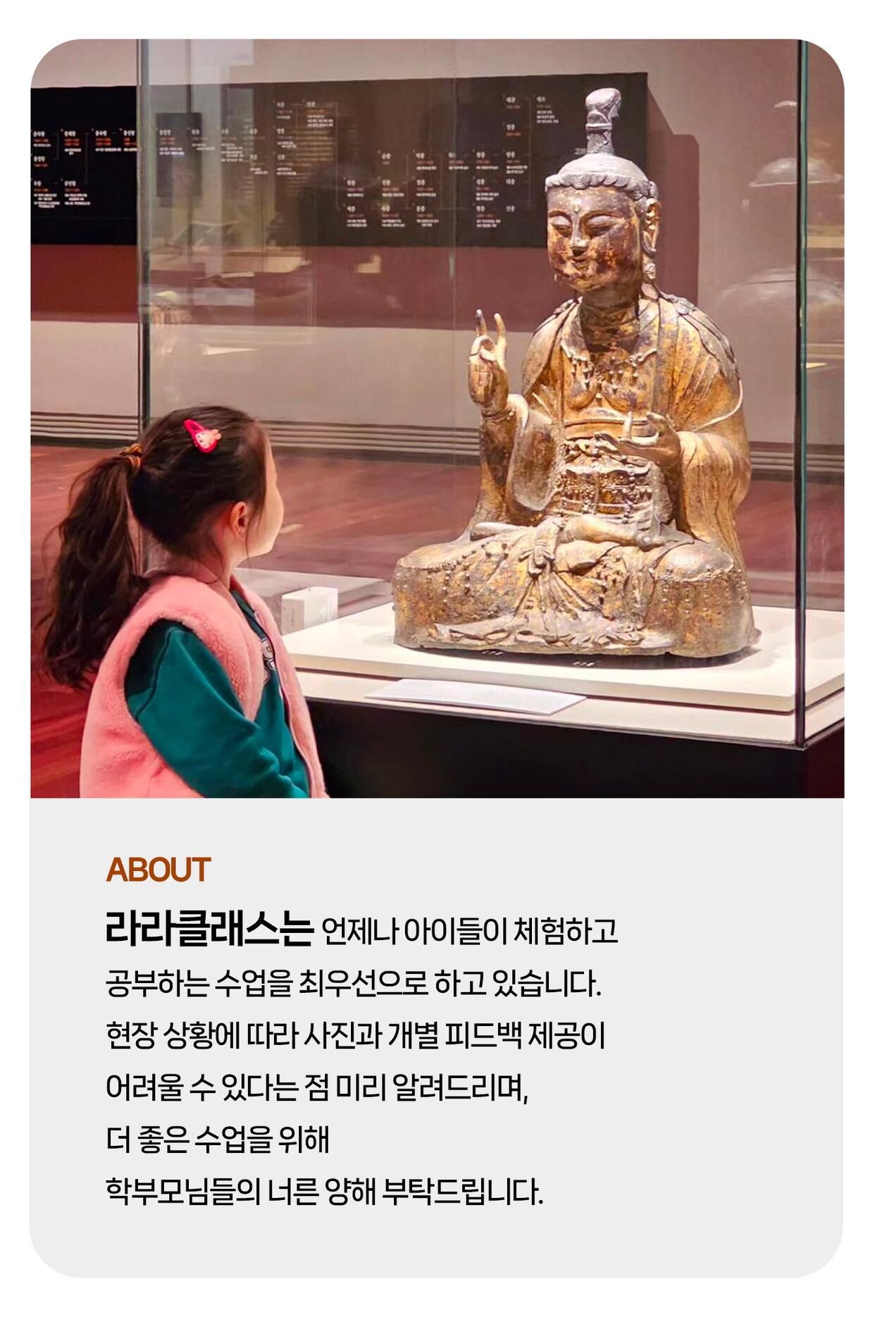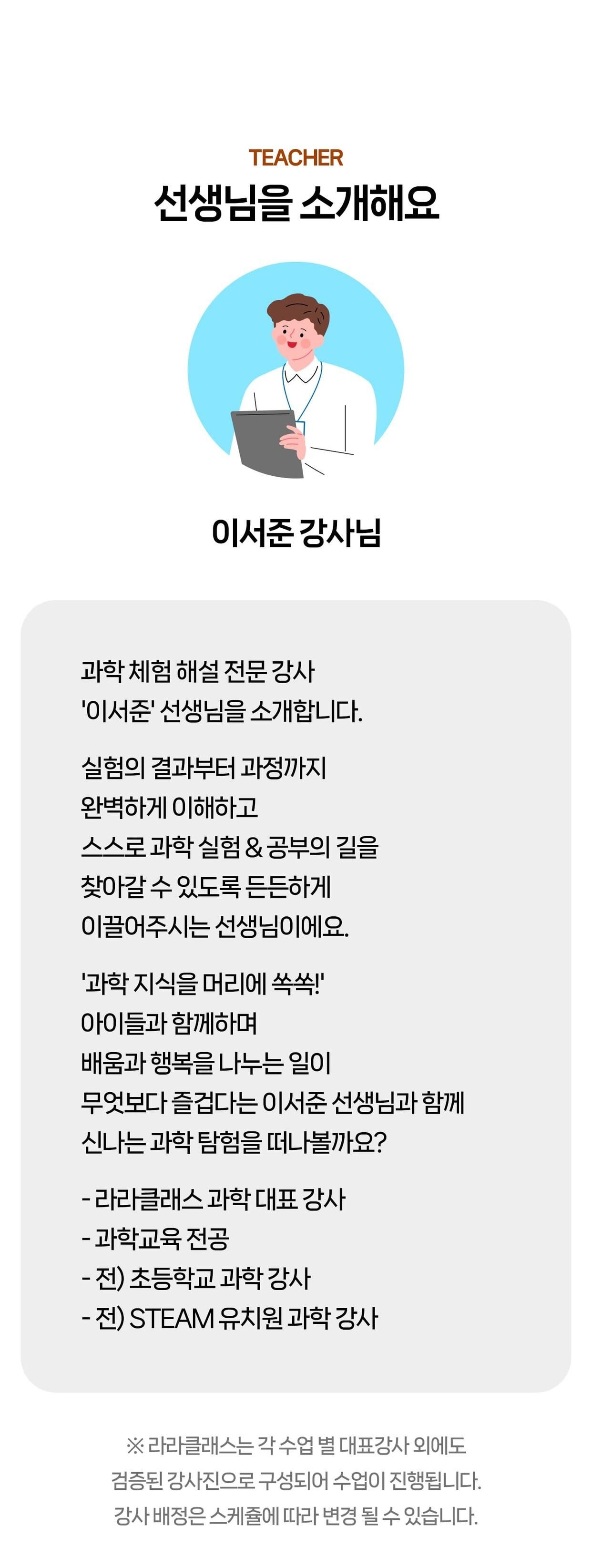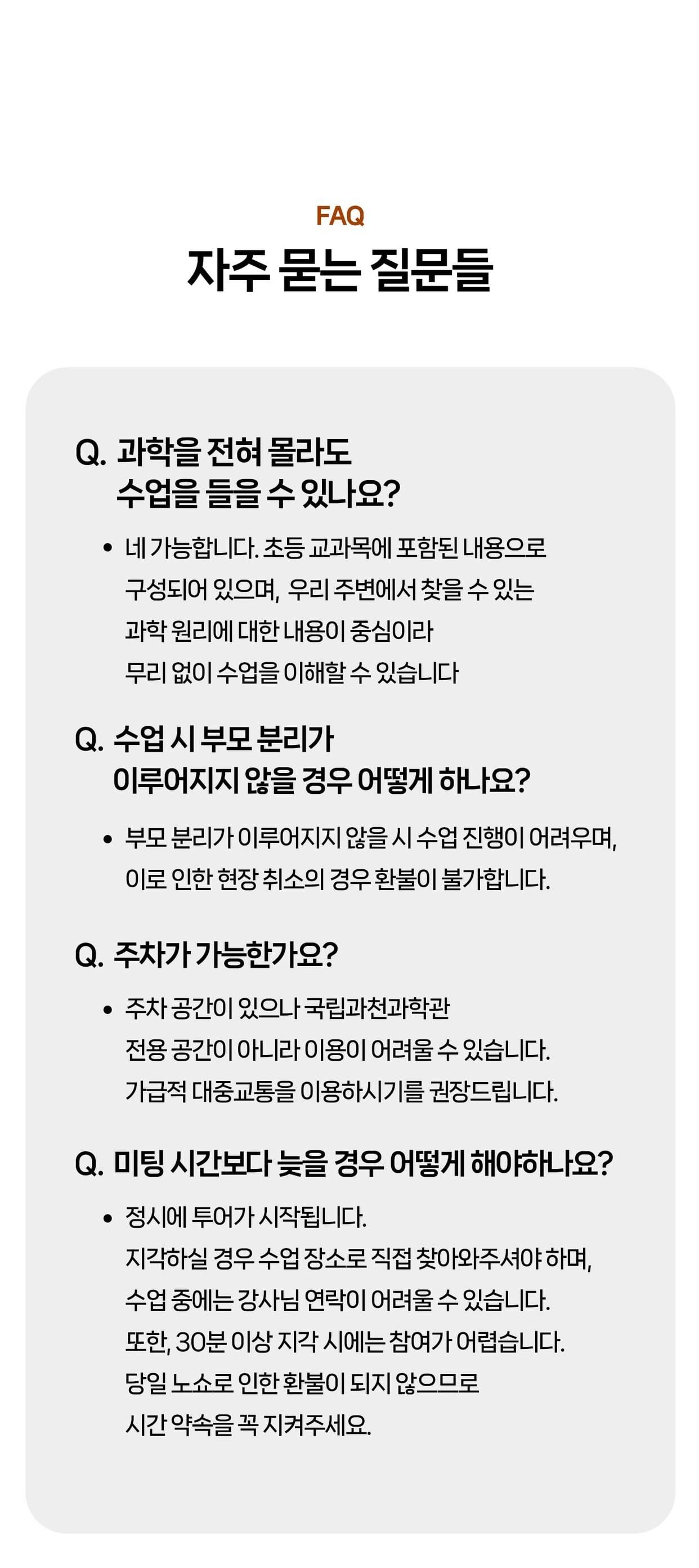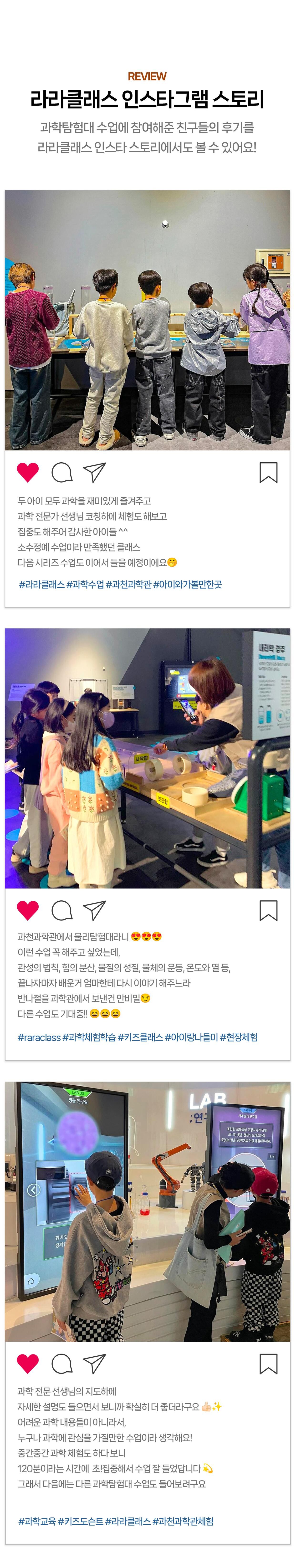[라라클래스] 놀면서 배우는 과학 원리! 미취학 자연사탐험대 -국립과천과학관 (6-8세) 본문: 로컬 DB 동기화 상세 포함 * 특허받은 과학 커리큘럼 * 과학 전공 강사와 함께 * 미취학 90분 수업 * 라라클래스 자체 제작 교재 * 과학교구 키트 불포함 * 과학관 입장권 (키오스크 개별 구매) * 개인 준비물 (끈달린 가방에 연필, 지우개, 마실 물 준비해주시면 좋습니다) 마이리얼트립에서 예약하기 과천 목록 도시 목록