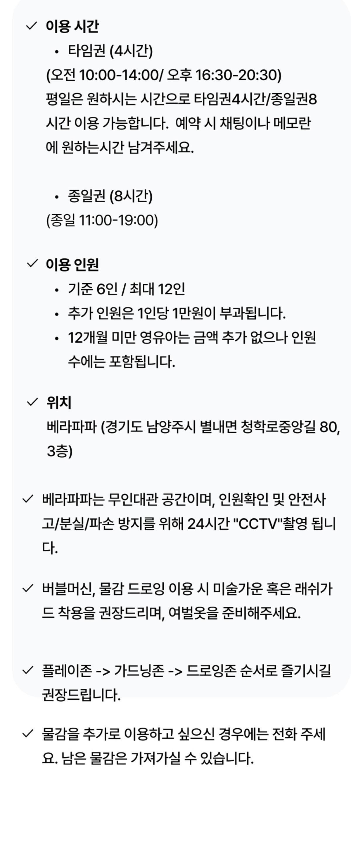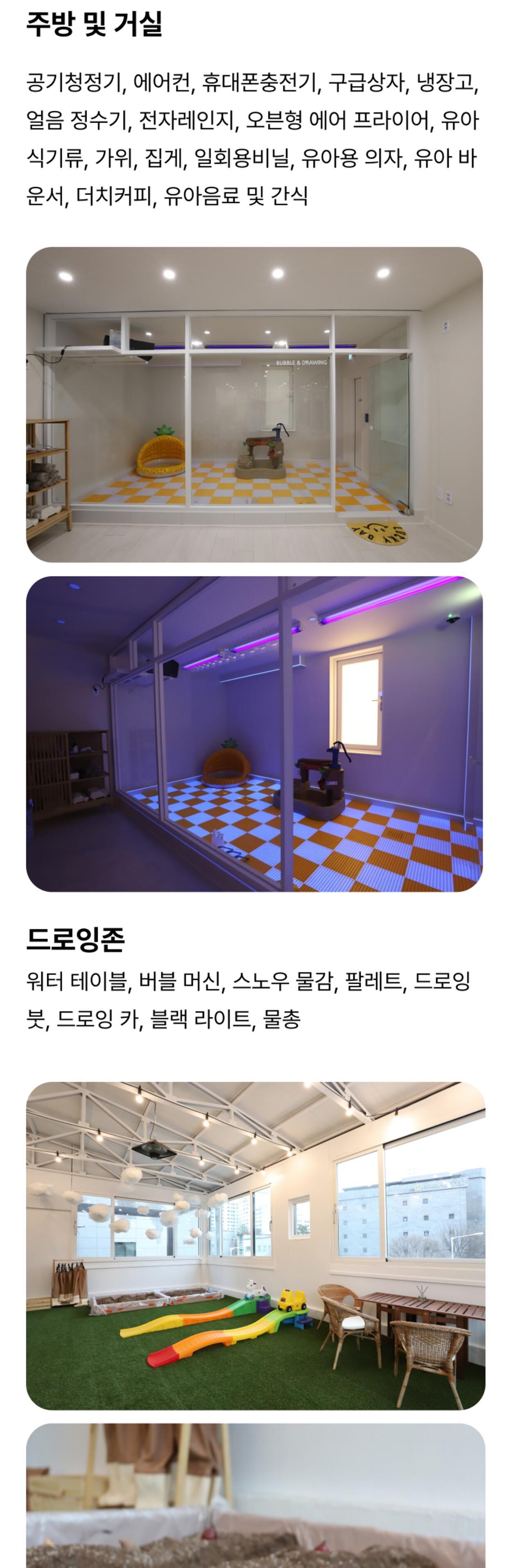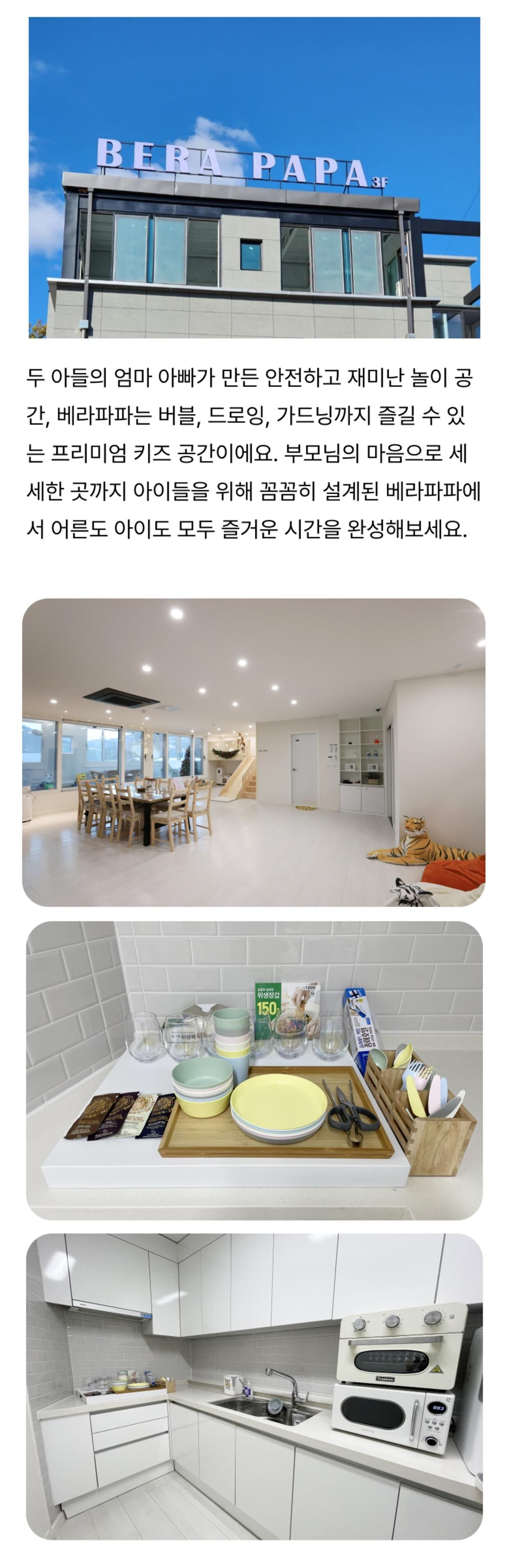 - - 베라파파 공간 이용료 타임권(4시간) / 종일권(8시간) 중 선택 (주방 및 거실) - 공기청정기, 에어컨, 휴대폰충전기, 구급상자, 냉장고, 얼음 정수기, 전자레인지, 오븐형 에어 프라이어, 유아 식기류, 가위, 집게, 일회용비닐, 유아용 의자, 유아 바운서, 더치커피, 유아음료 및 간식 (드로잉존) - 워터 테이블, 버블 머신, 스노우 물감, 팔레트, 드로잉 붓, 드로잉 카, 블랙 라이트, 물총 (가드닝존) - 가드닝 체험용 전신가운, 가드닝 장화