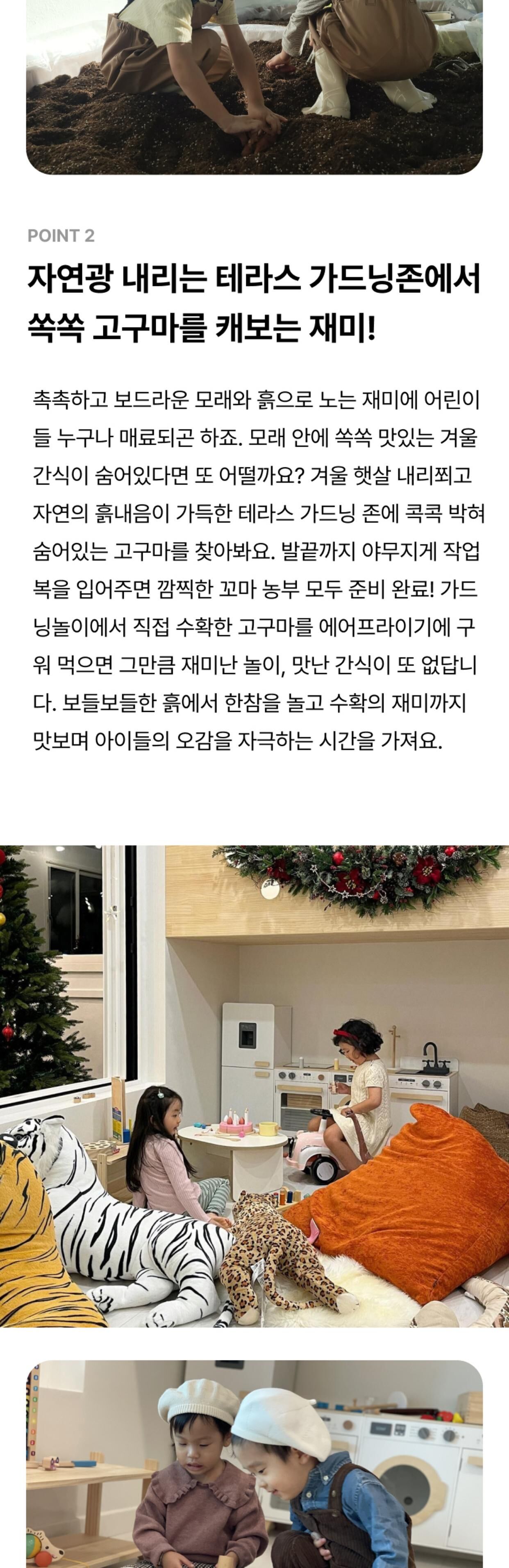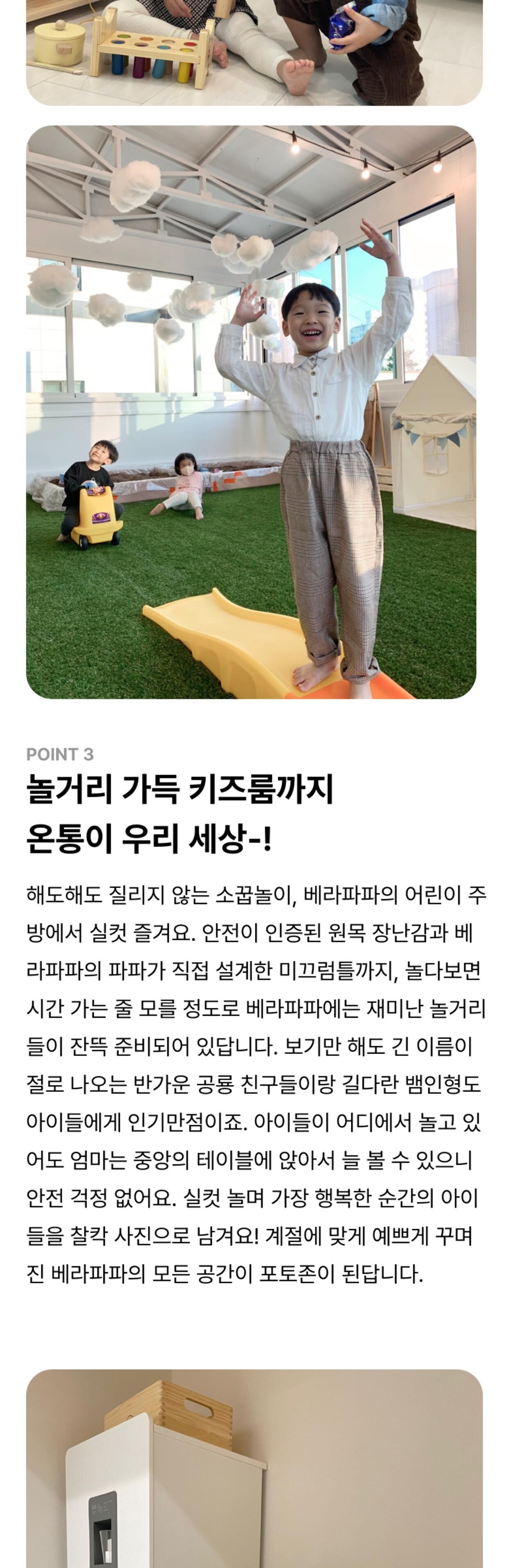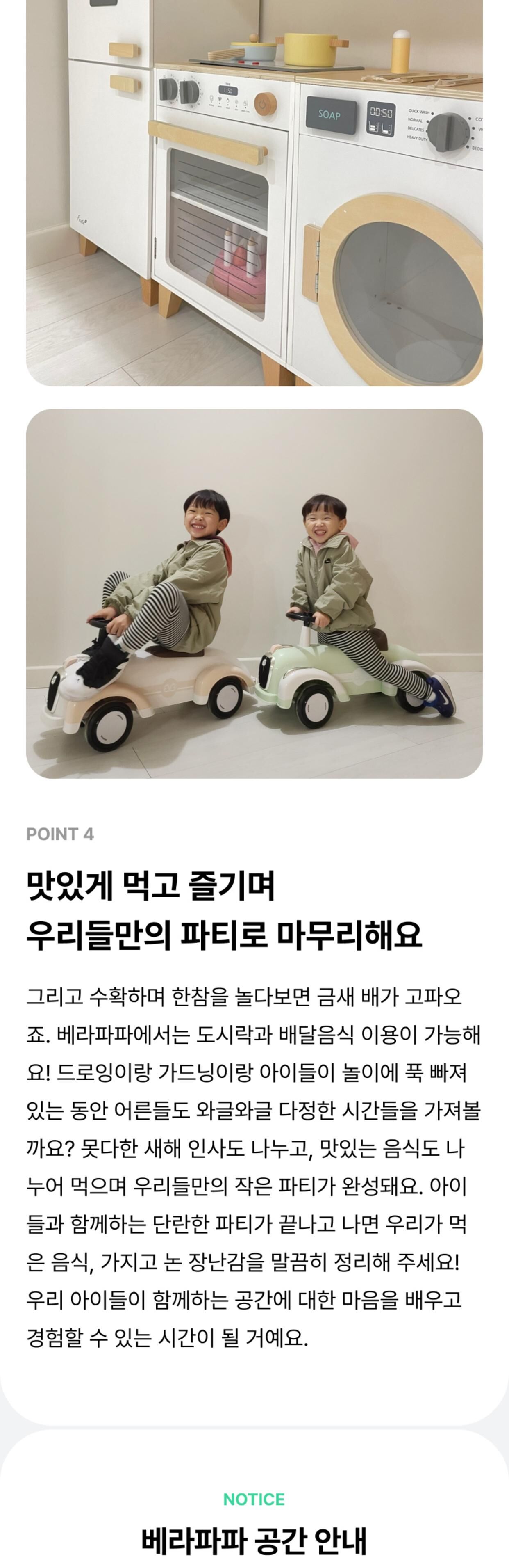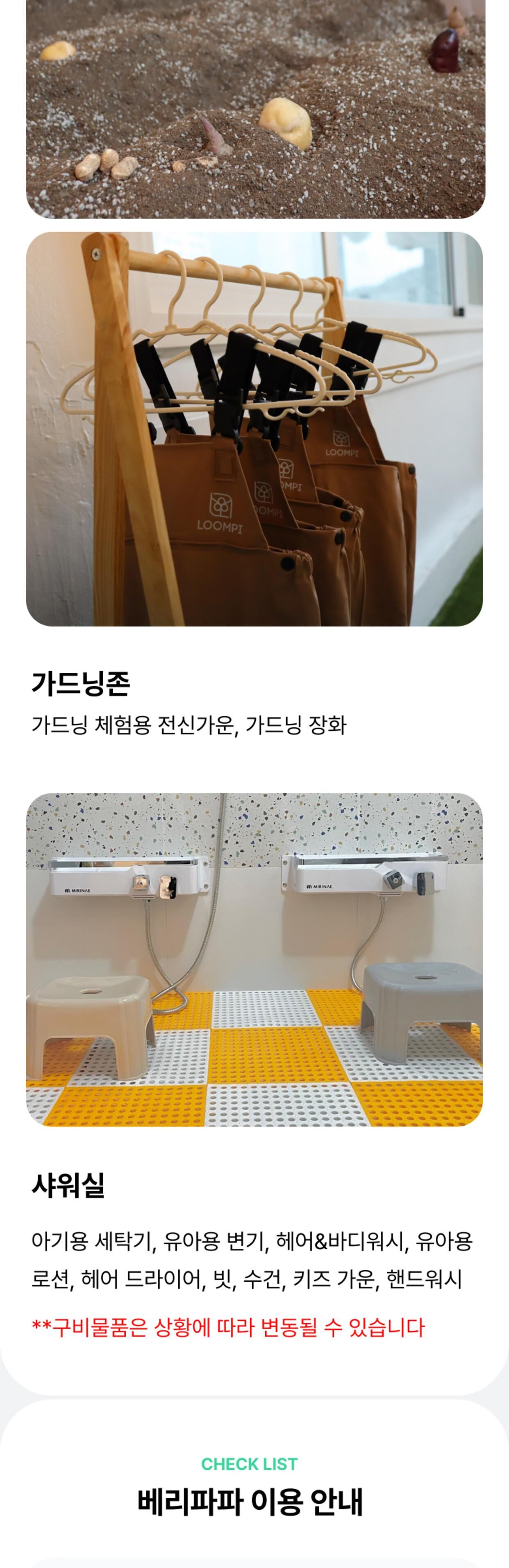- - 베라파파 공간 이용료 타임권(4시간) / 종일권(8시간) 중 선택 (주방 및 거실) - 공기청정기, 에어컨, 휴대폰충전기, 구급상자, 냉장고, 얼음 정수기, 전자레인지, 오븐형 에어 프라이어, 유아 식기류, 가위, 집게, 일회용비닐, 유아용 의자, 유아 바운서, 더치커피, 유아음료 및 간식 (드로잉존) - 워터 테이블, 버블 머신, 스노우 물감, 팔레트, 드로잉 붓, 드로잉 카, 블랙 라이트, 물총 (가드닝존) - 가드닝 체험용 전신가운, 가드닝 장화