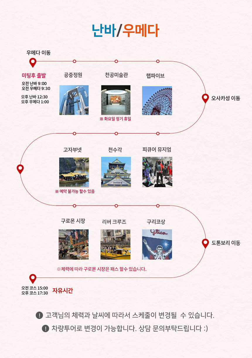 최대한 짧은 시간에 오사카 시내를 둘러보는 알뜰한 코스이며, 처음 오사카를 오신분들에게 투어 기간의 스케줄과 정보도 상담해 드리며 맛집또한 예약해 드립니다.