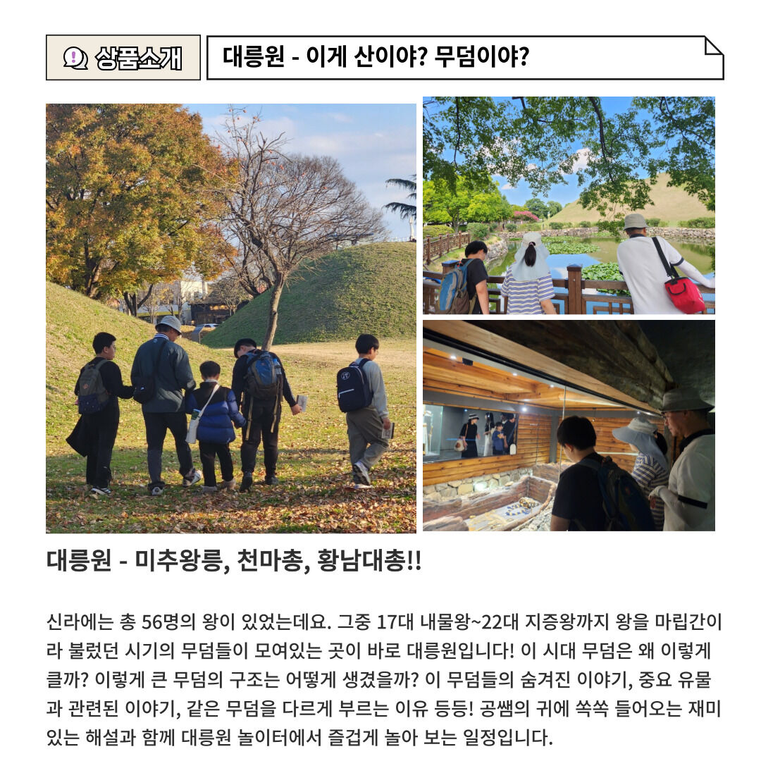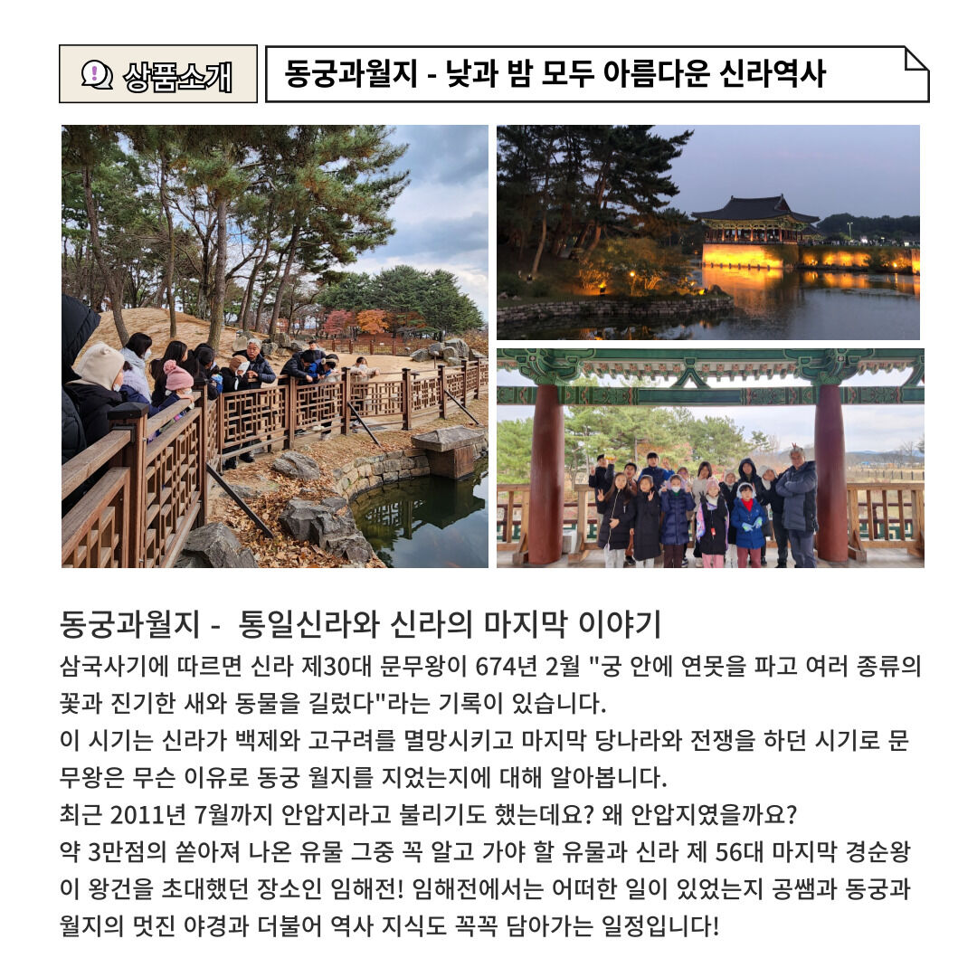 [역사와답사] 공쌤과 경주역사지구 도보투어 함께해요! -대릉원,첨성대,동궁과월지(야경포함) 평점 5 · 리뷰 11건 포함 가이드 비용 불포함 입장료 (대릉원은 입장료가 없지만 천마총은 입장료가 있습니다) ☆천마총 입장료 - 어른 3,000원/ 어린이 1,000원 ☆동궁과월지 입장료 - 어른 3,000원/ 어린이 1,000원 교통비 개인경비 및 식음료 여행자보험은 개별 가입을 권장 드립니다. 마이리얼트립에서 예약하기 경주 목록 도시 목록