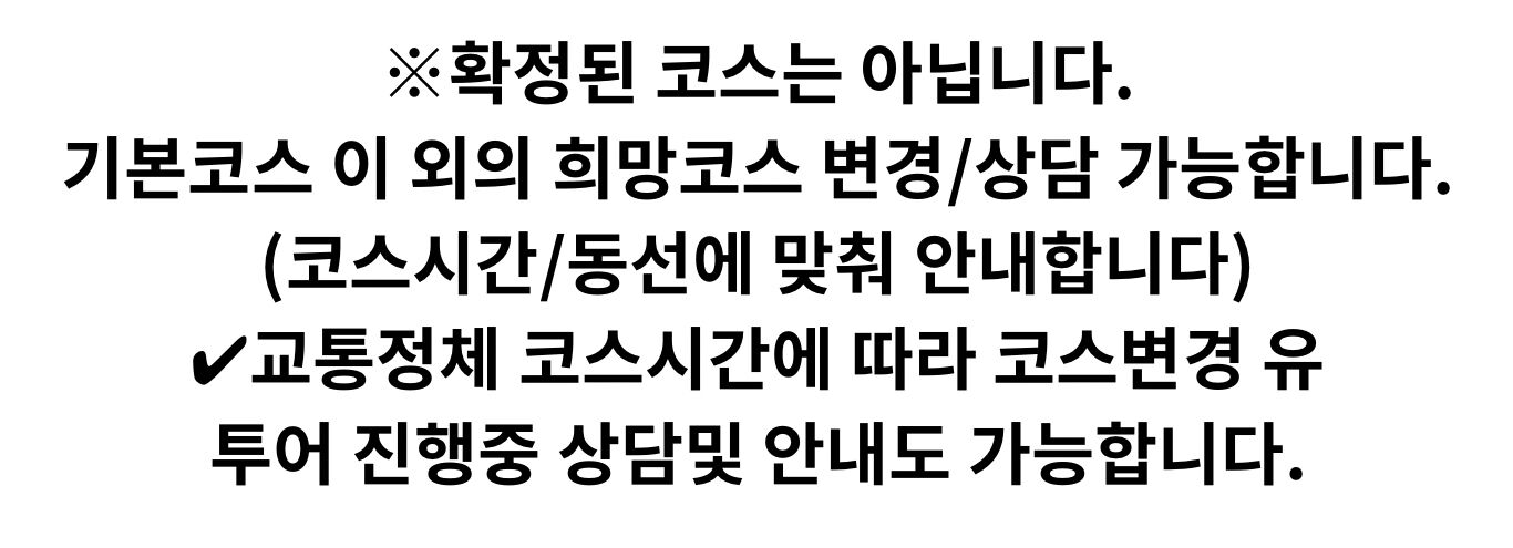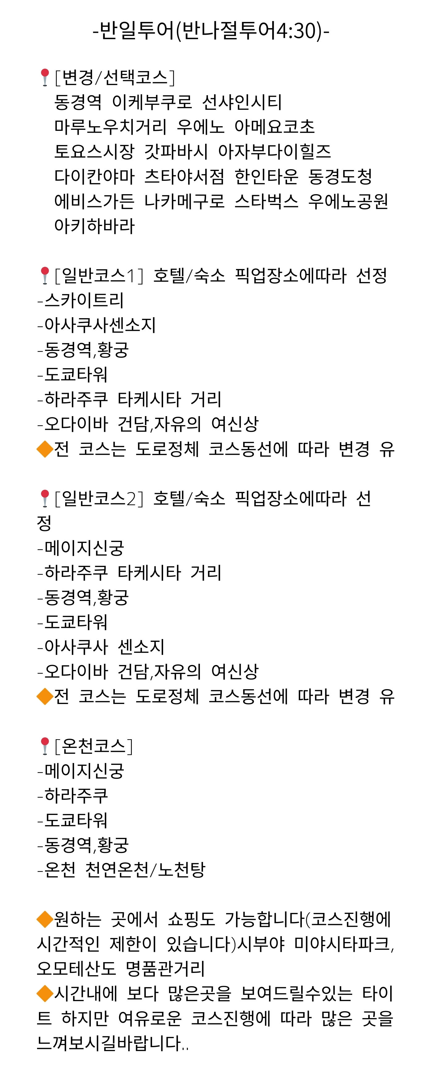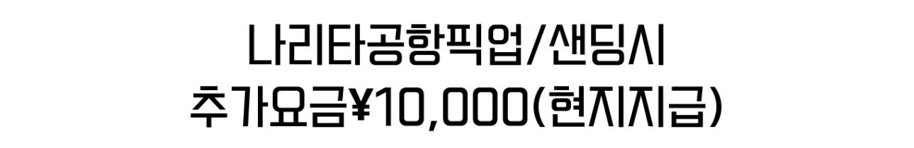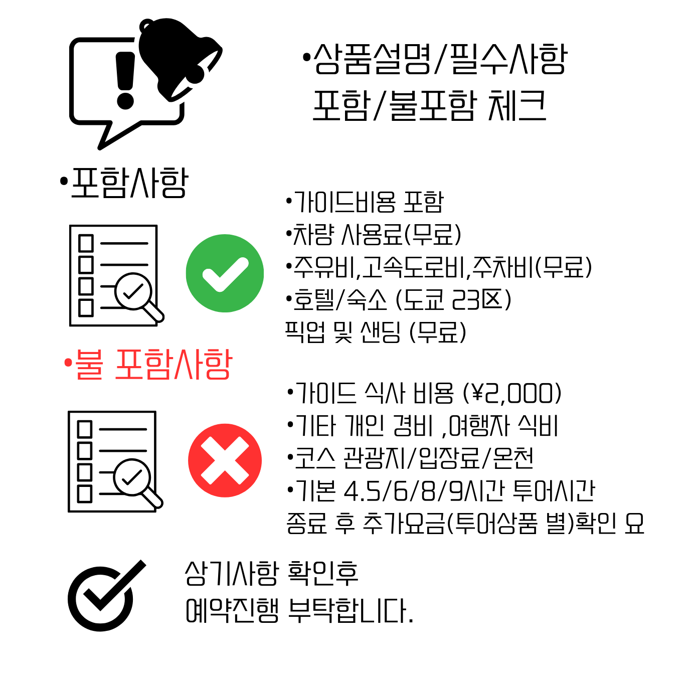 - ★ 가이드 식사 비용 (¥2,000) ★ 기타 개인 경비 ★ 여행자 식비 ★ 코스 관광지/입장료/온천 ★ 공항/호텔~픽업/센딩 6시간 기본시간 종료 후 추가요금 ★ 도쿄 23개 구(区) 제외한 도쿄지역市(26시) 픽업/센딩 서비스 ¥5,000~¥30,000의 추가 요금이 발생하며, 당일 지급 부탁 드립니다.