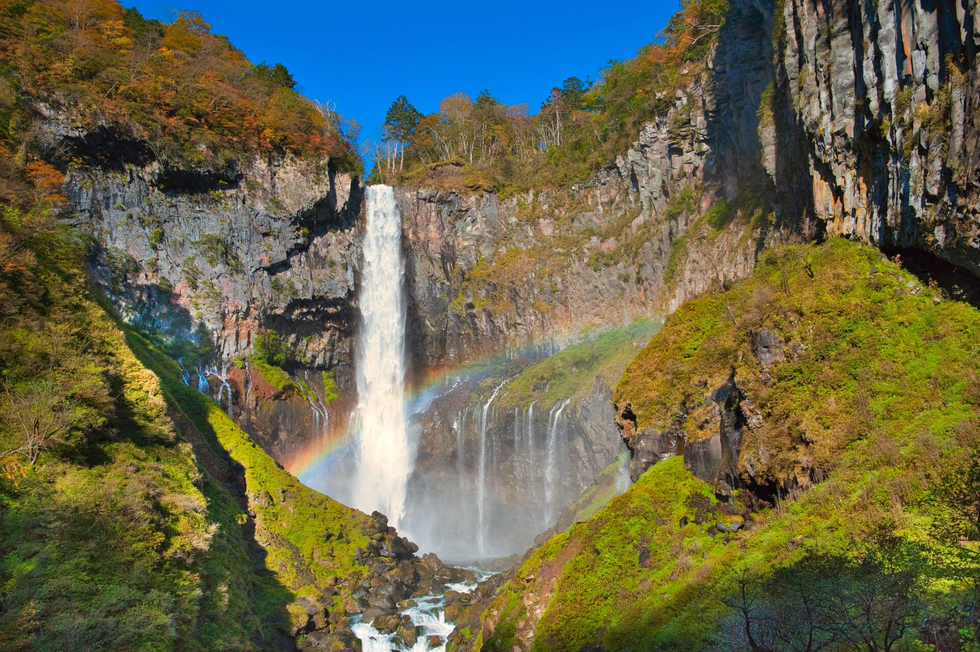 케곤폭포는 일본 도치기현 닛코시에 위치한 일본 3대 명폭 중 하나로, 높이 97m의 웅장한 폭포입니다.