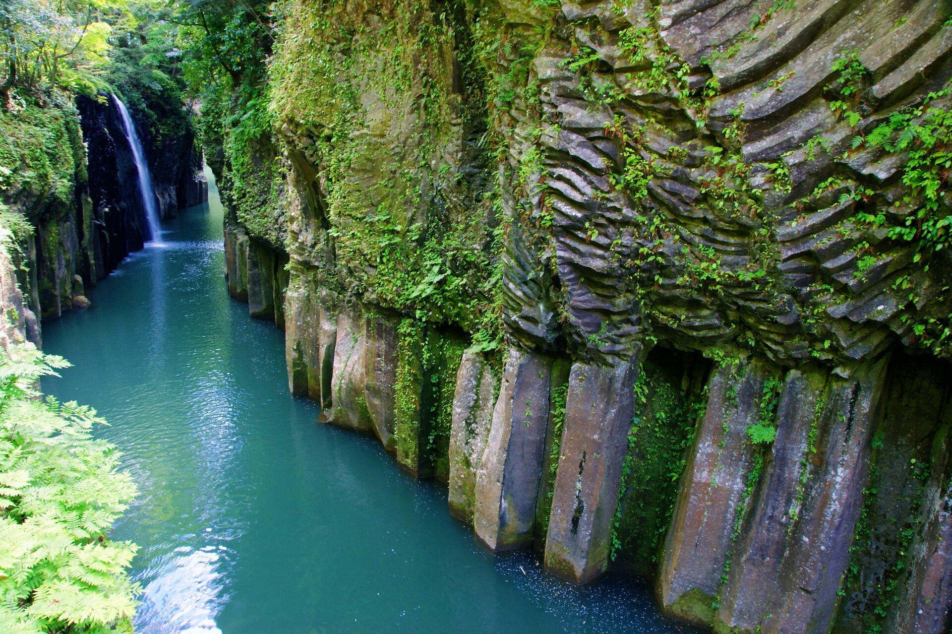 【다카치호 협곡】타카치호 협곡은 오래전 아소산 화산 폭발 후 형성된 계곡입니다. 양쪽에 단층절벽이 있고, 17미터 높이의 낙차를 가진 마나이 폭포가 있으며, 아름다운 절경과 함께 같은 협곡에 세 개의 다리가 놓여 있다는 점이 타카치호 협곡의 아름다움입니다.