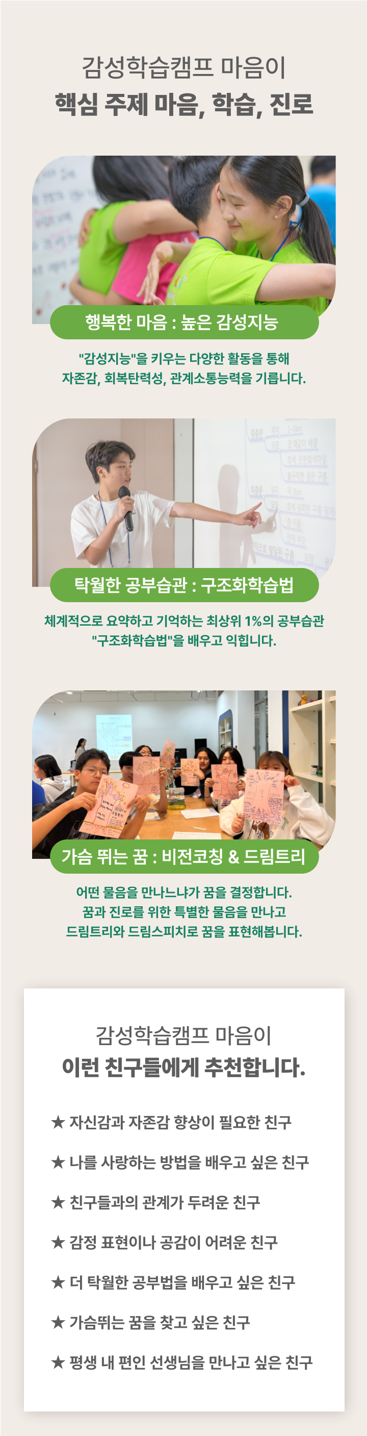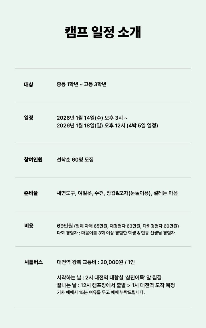 [키즈][논산] 감성학습캠프 마음이 27기 중고등부, 청소년을 위한 최고의 방학캠프 포함 숙박비 건강한 정식비 구조화코칭 워크북 셔틀버스 이용비(옵션) 불포함 세면도구, 여벌옷, 수건, 장갑&모자(눈놀이용)은 미리 준비 부탁드립니다. 개별 여행자 보험 마이리얼트립에서 예약하기 논산 목록 도시 목록