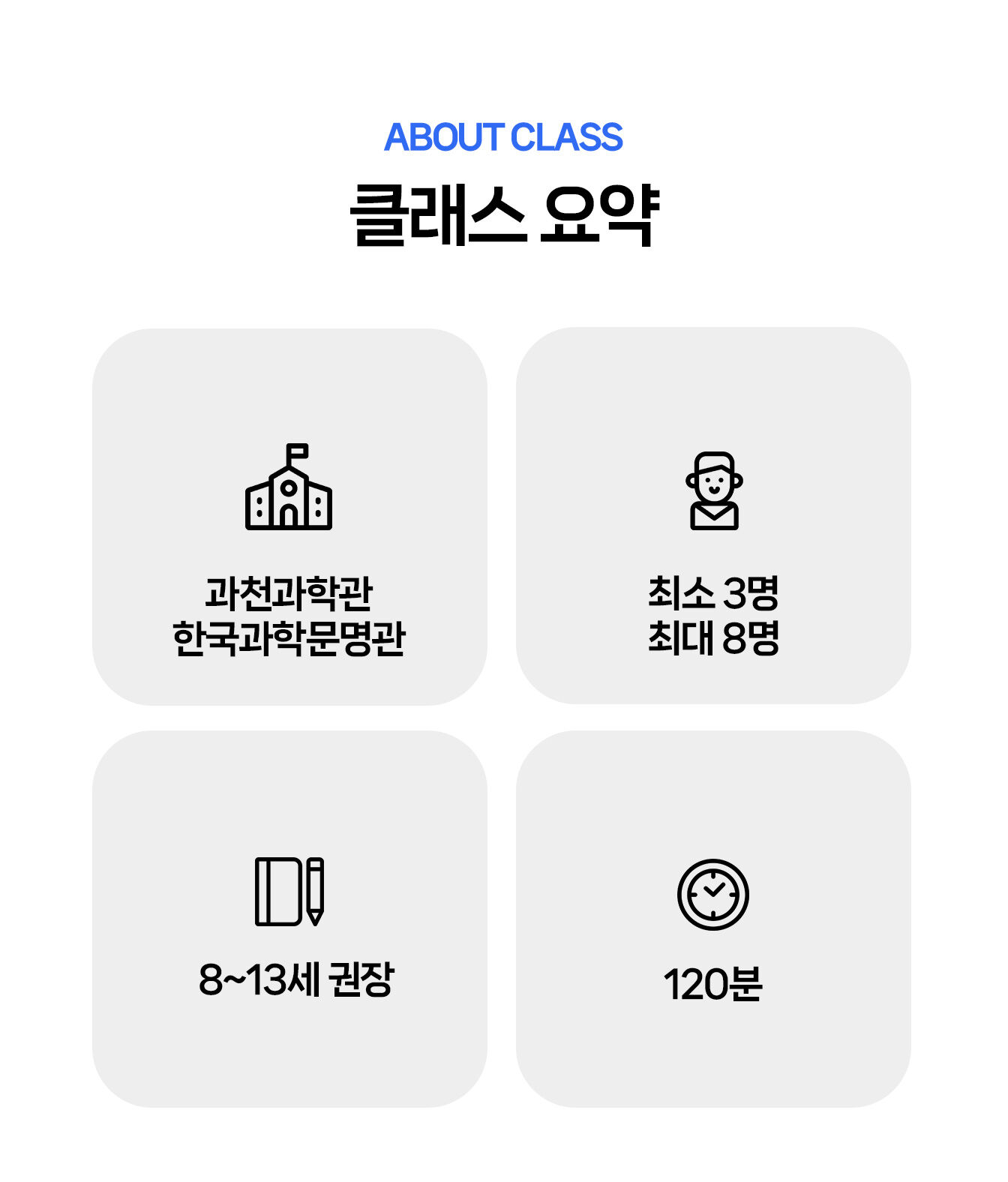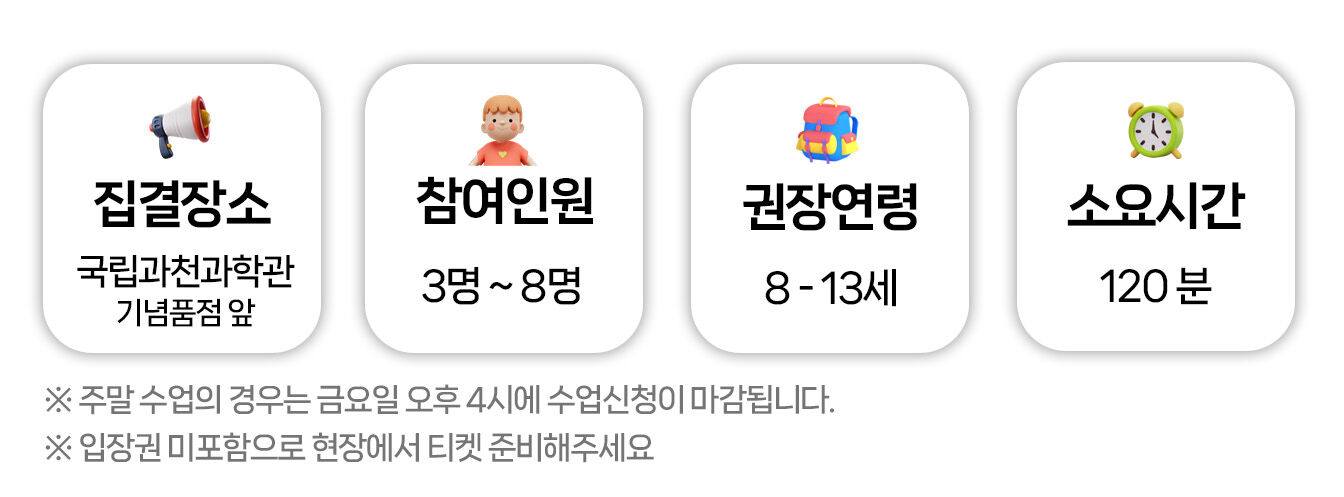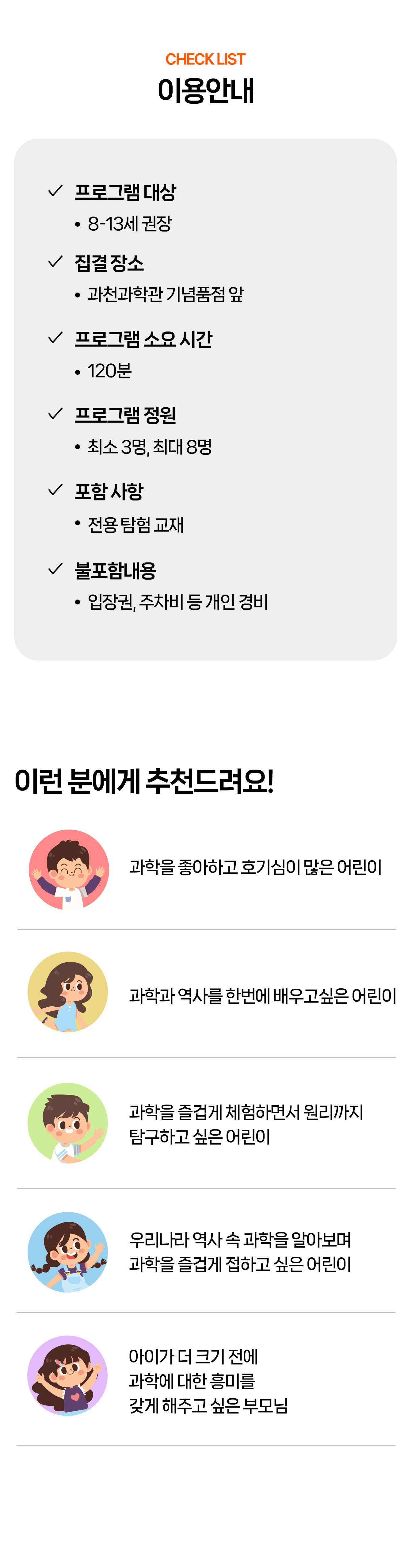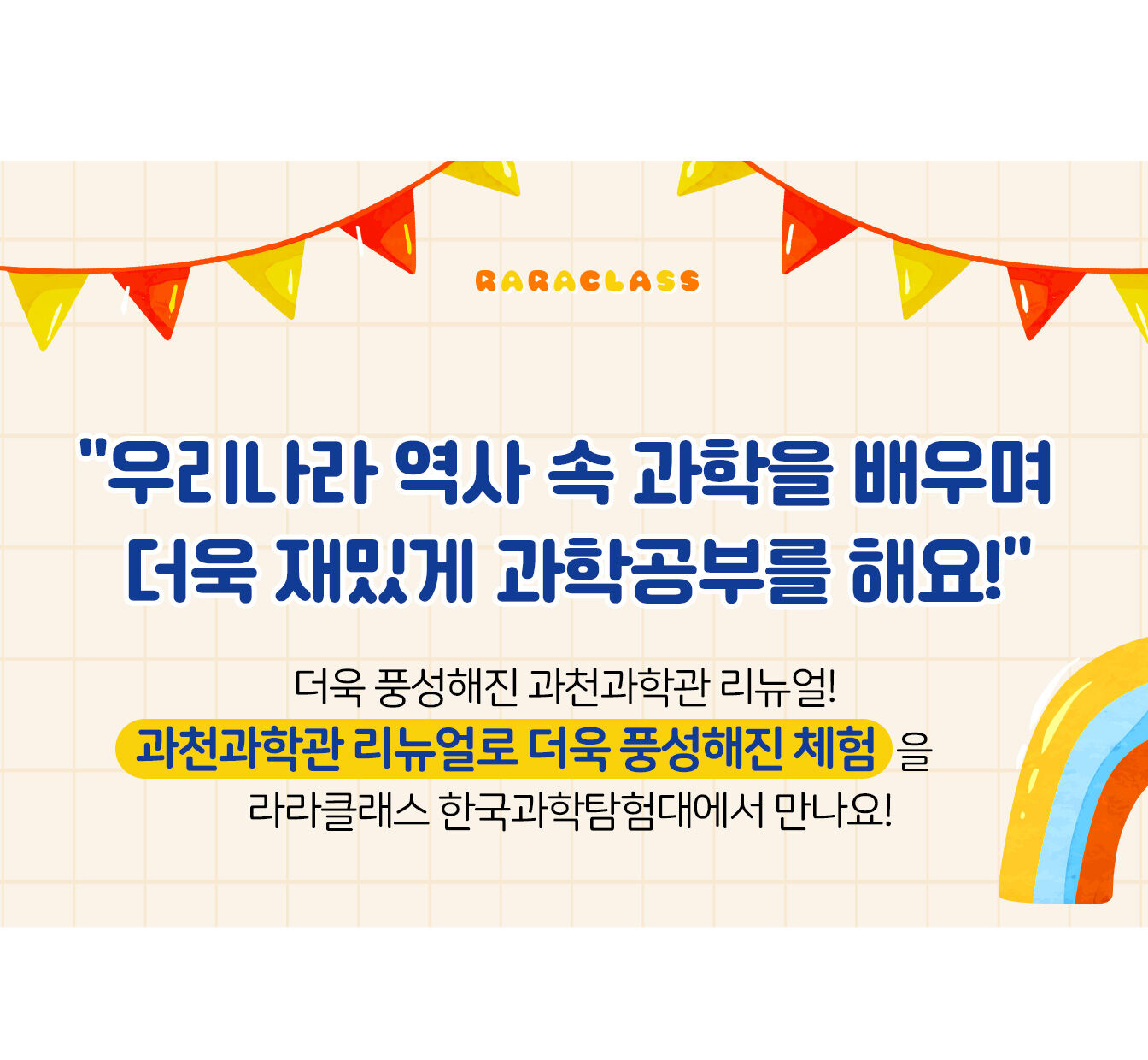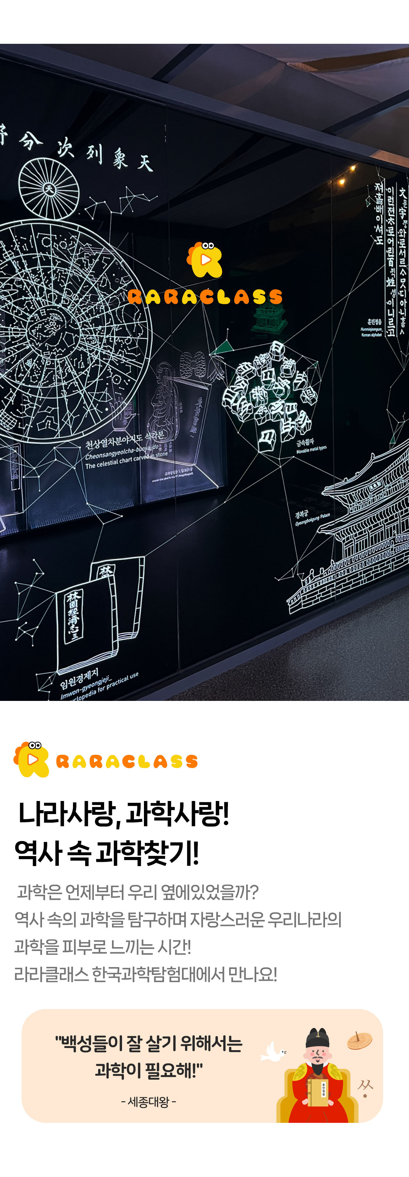 [라라클래스] 초등 한국과학탐험대! 한국사 속 숨겨진 과학 기술을 찾아! - 국립과천과학관 본문: 로컬 DB 동기화 상세 포함 * 특허받은 과학 커리큘럼 * 과학 전공 강사와 함께 * 초등 120분 수업 * 라라클래스 자체 제작 교재 * 연계활동 키트 불포함 * 개인 준비물 (끈달린 가방에 연필, 지우개, 마실물 준비해주시면 좋습니다) * 입장권 2000원 (7세 미만무료) 마이리얼트립에서 예약하기 과천 목록 도시 목록