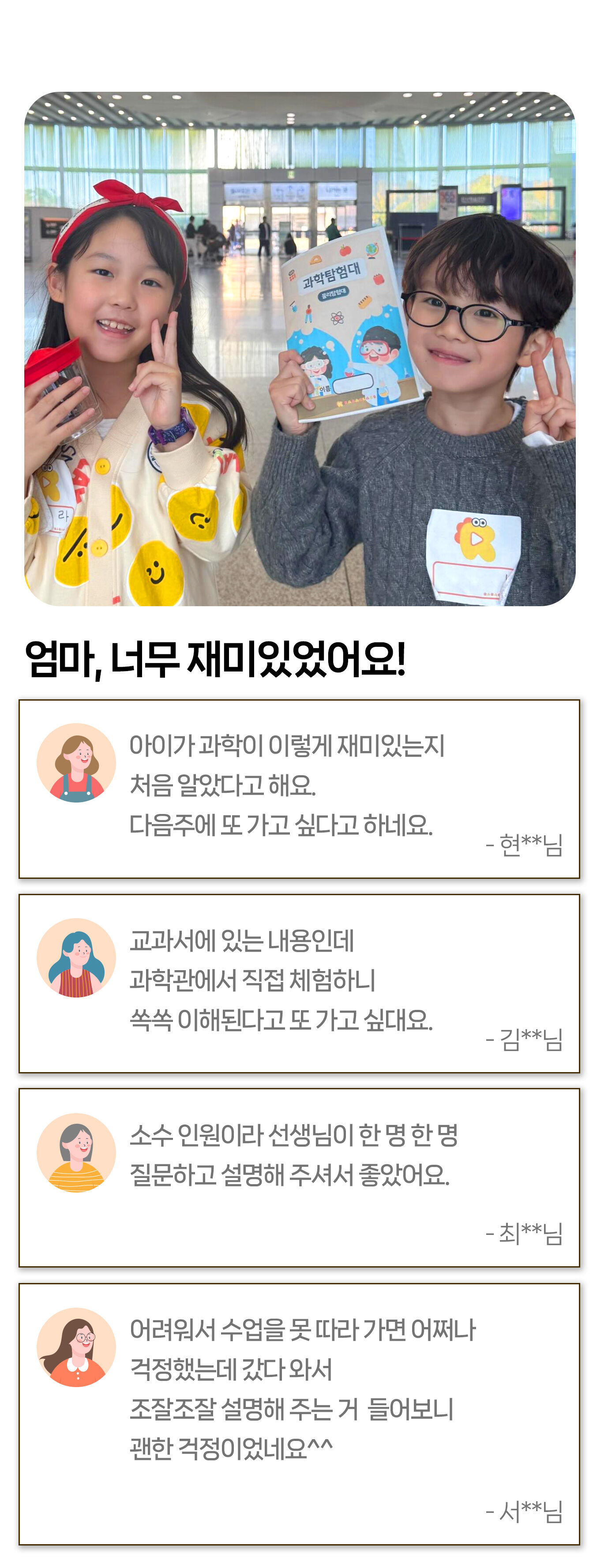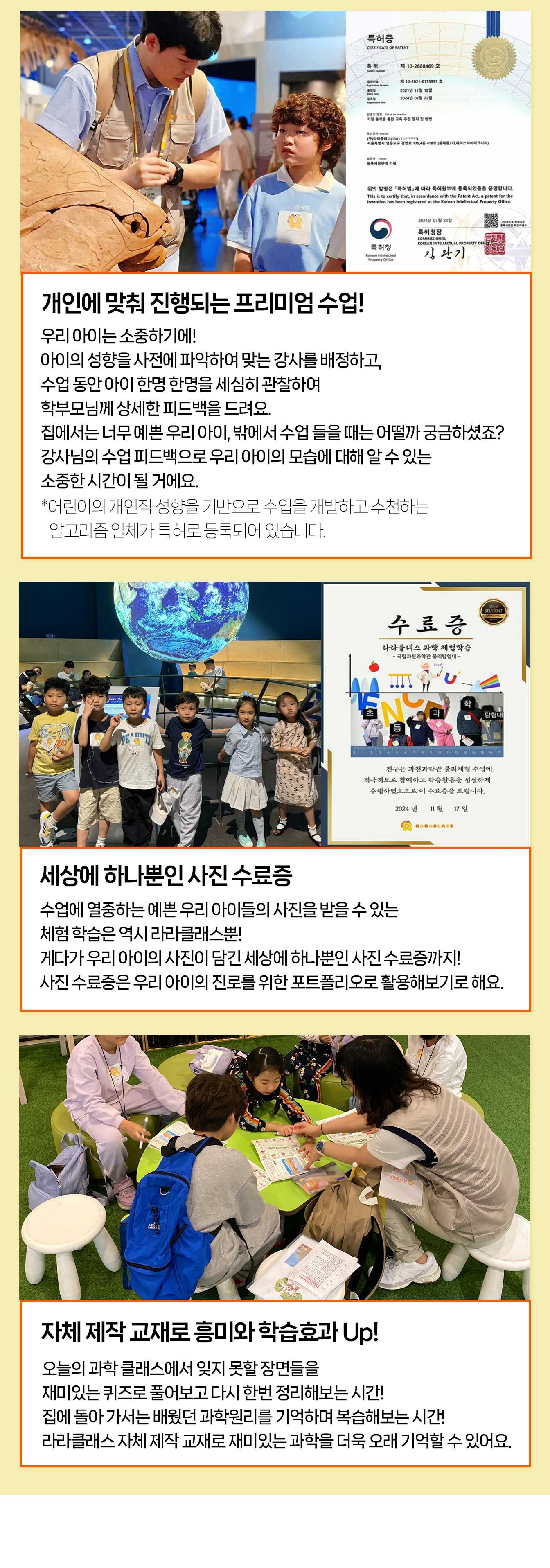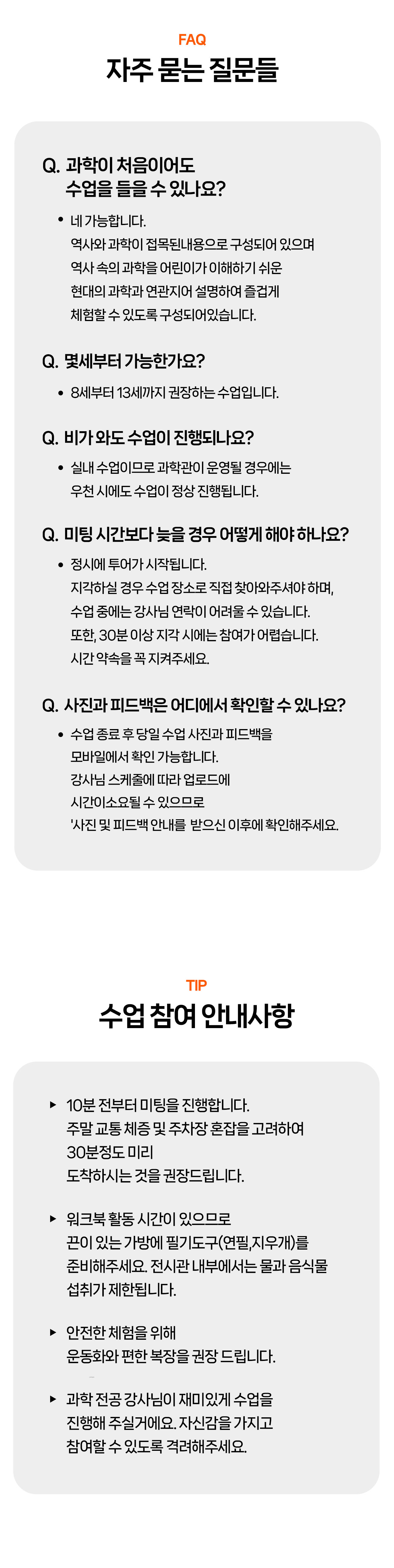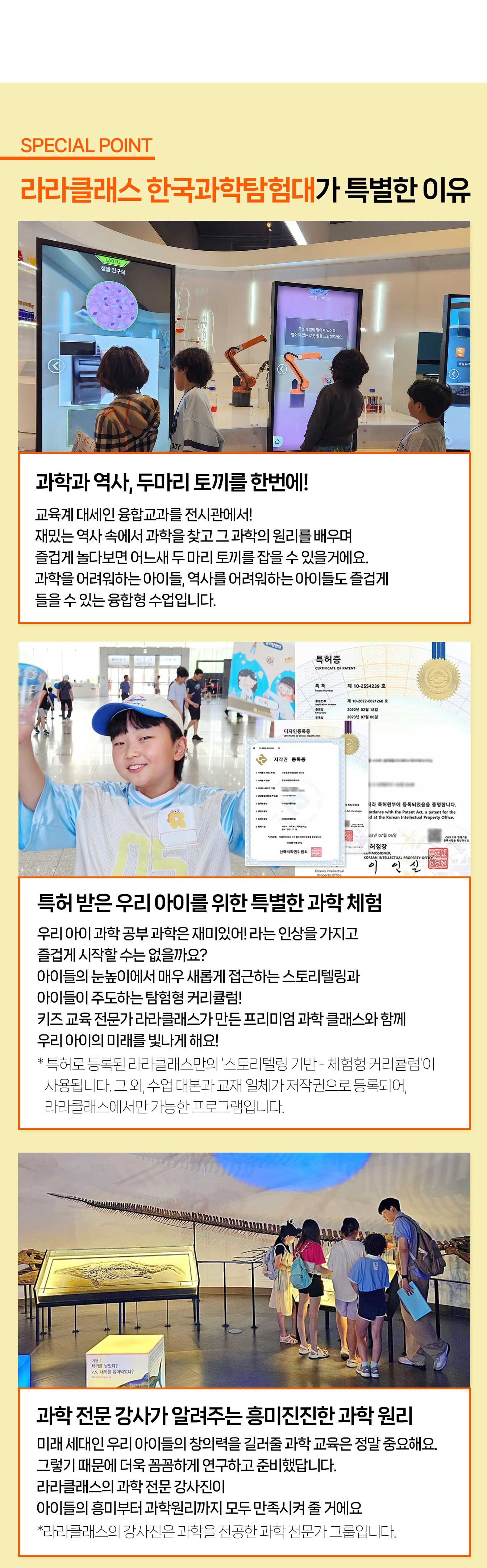 [라라클래스] 초등 한국과학탐험대! 한국사 속 숨겨진 과학 기술을 찾아! - 국립과천과학관 본문: 로컬 DB 동기화 상세 포함 * 특허받은 과학 커리큘럼 * 과학 전공 강사와 함께 * 초등 120분 수업 * 라라클래스 자체 제작 교재 * 연계활동 키트 불포함 * 개인 준비물 (끈달린 가방에 연필, 지우개, 마실물 준비해주시면 좋습니다) * 입장권 2000원 (7세 미만무료) 마이리얼트립에서 예약하기 과천 목록 도시 목록
