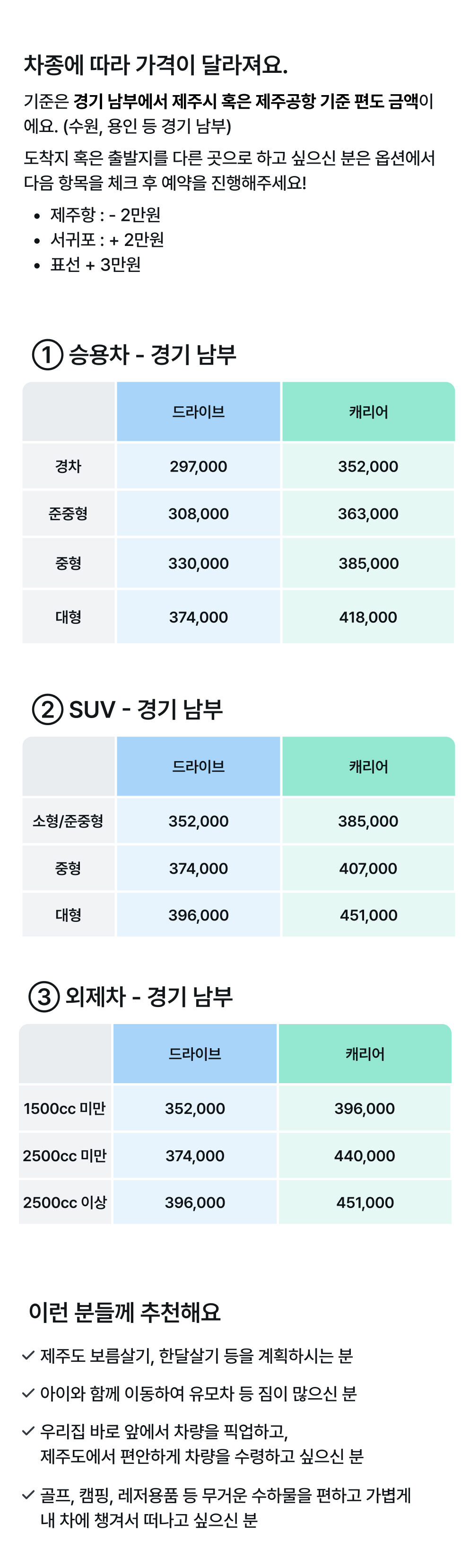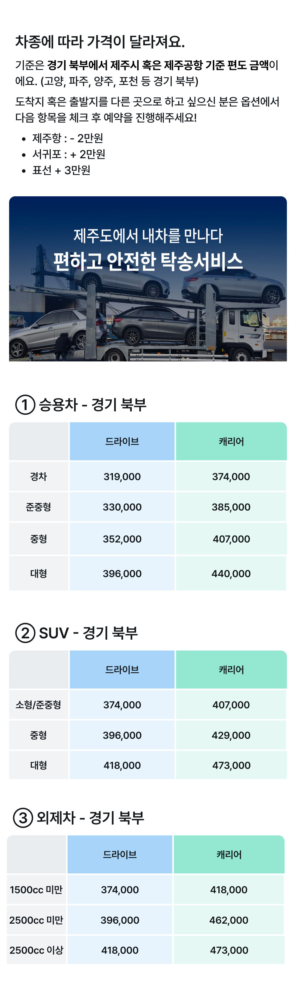 [경기 - 제주 편도] 제주도 차량 탁송 서비스 (편도/왕복) 카 캐리어, 로드 탁송 가능