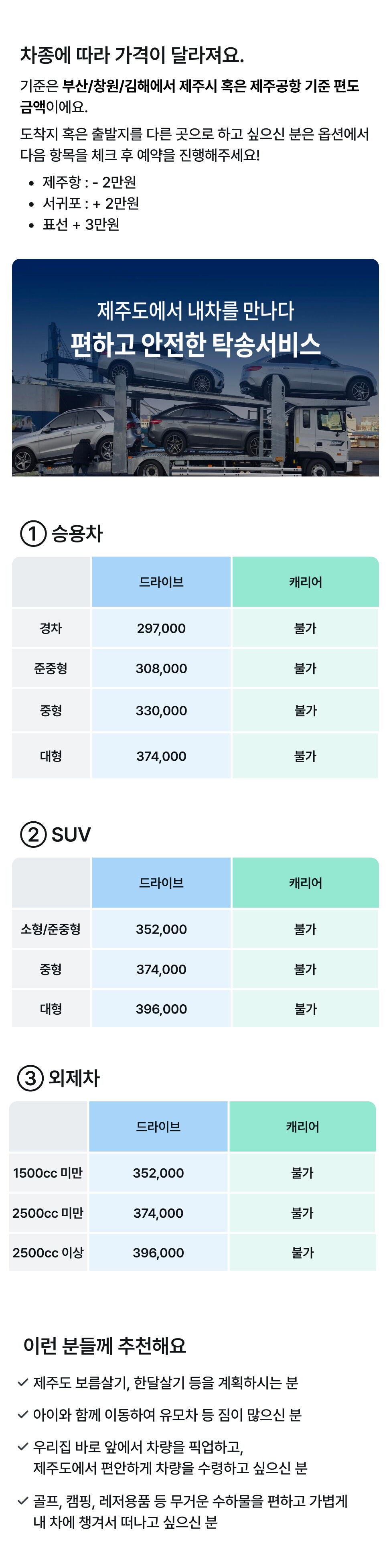 [부산/창원/김해 - 제주 편도] 제주도 차량 탁송 서비스 카 캐리어, 로드 탁송 가능