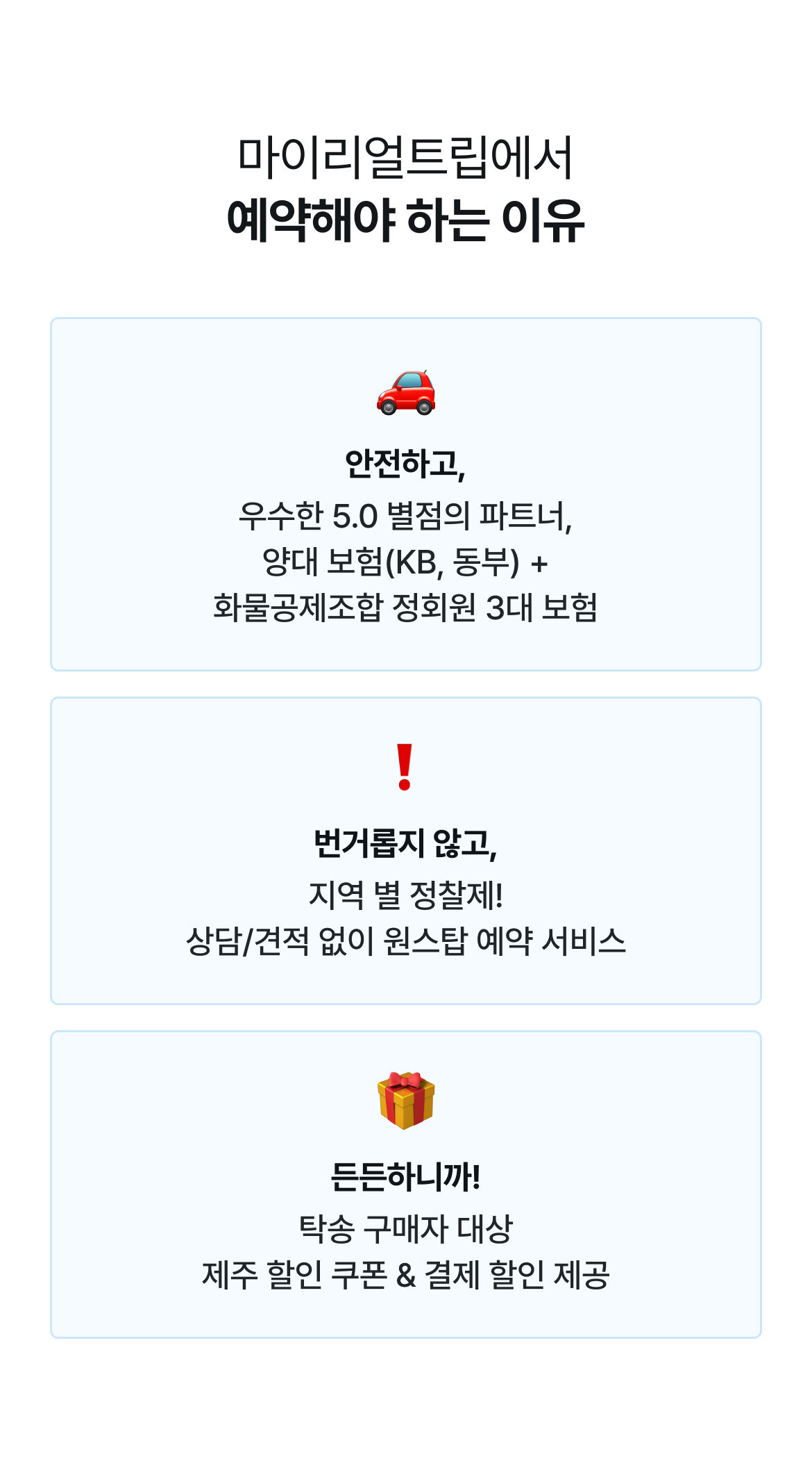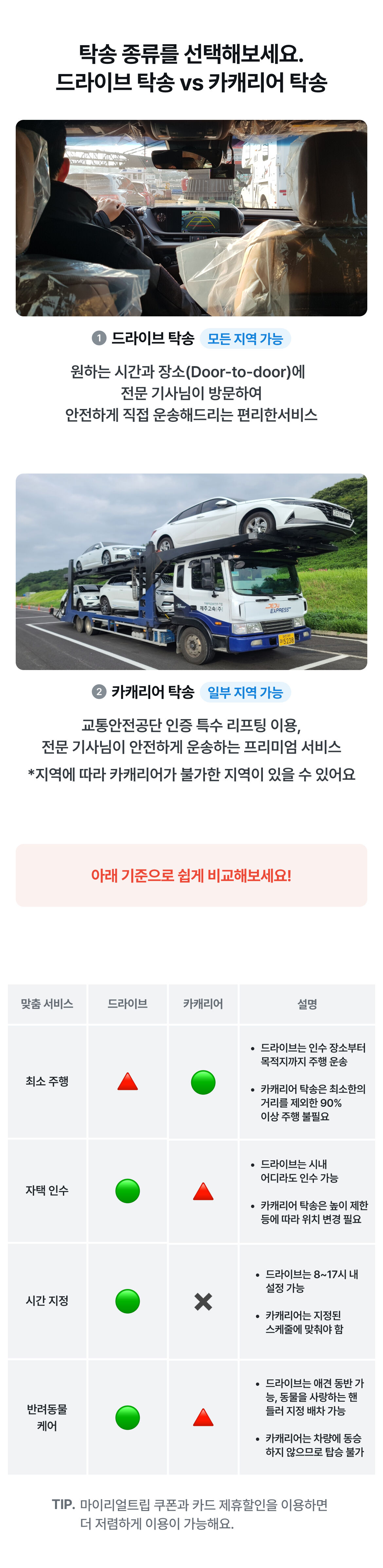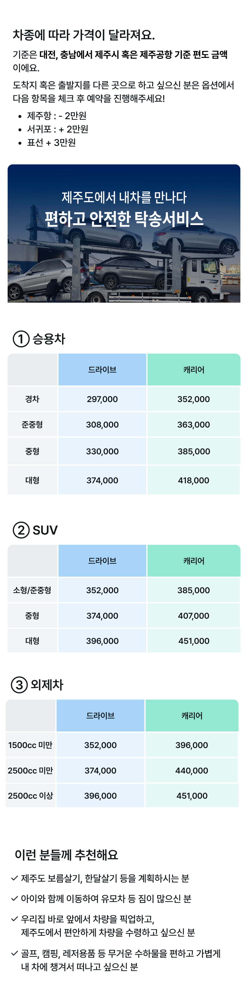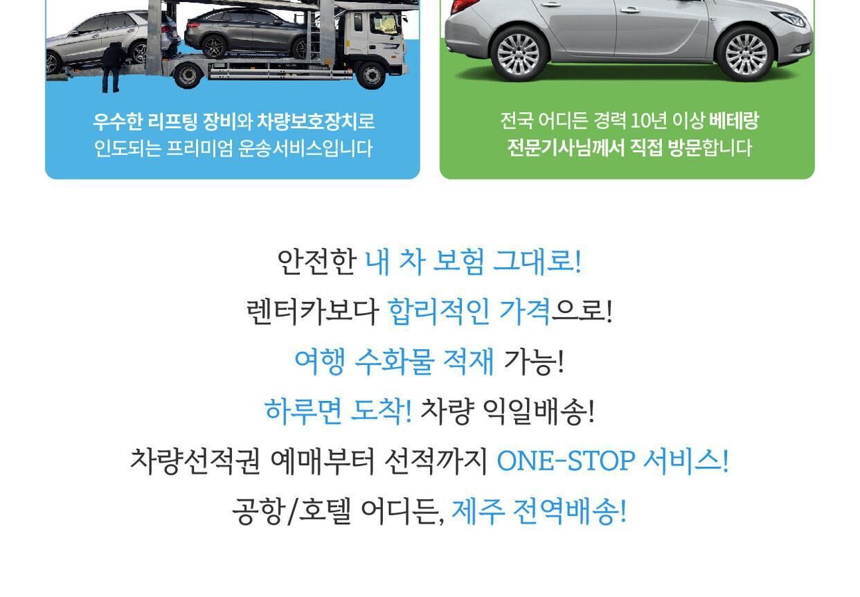 [대전/충남 - 제주 편도] 제주도 차량 탁송 서비스 카 캐리어, 로드 탁송 가능 본문: 로컬 DB 동기화 상세 포함 - 운송 설계 - KTA/DB/KB 탁송 보험 - 베테랑 안심기사 지정배차 - 탁송 과정에서 발생하는 통행료/과태료 (주정차/주행) - 항공기 결항으로 인한 인수 지연 시 보관료 면제 불포함 - 드라이브 탁송 진행 시, 주유 full 필수 (유류비 미포함) (인수 맡길 당시, full 로 주유한 상태로 전달주세요) - 예정 목적지 변경 시, 추가요금 발생 마이리얼트립에서 예약하기 대전 목록 도시 목록
