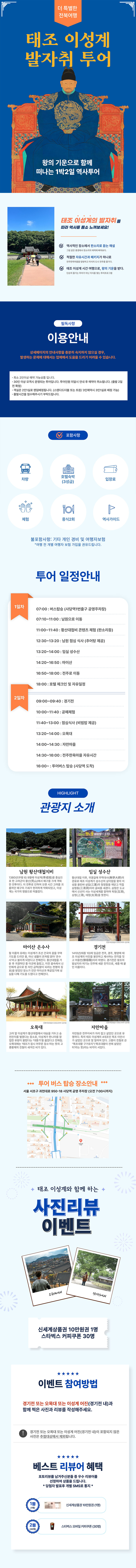[전북 전주한옥마을] 태조 이성계 발자취 1박2일 역사 투어 포함 차량(45인승버스), 가이드, 호텔숙박(3성급), 입장료(마이산,경기전), 체험비, 중식2, 문화콘텐츠 불포함 조식 및 석식, 기타 개인 비용, 개별여행자보험(여행 전 개별 여행자 보험 가입을 권유드립니다) 마이리얼트립에서 예약하기 전주 목록 도시 목록