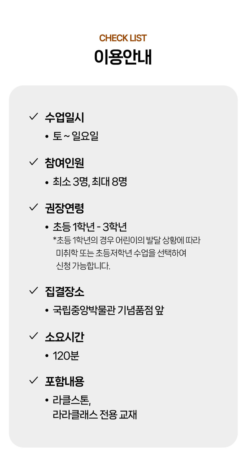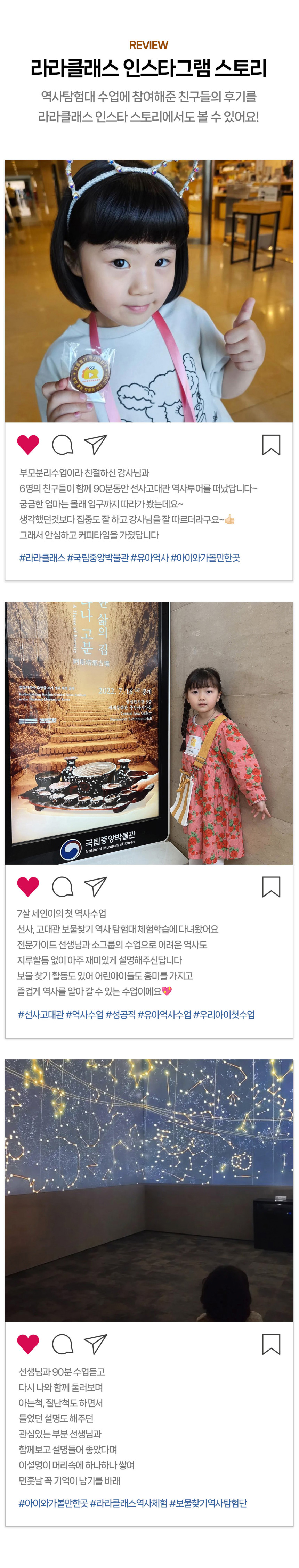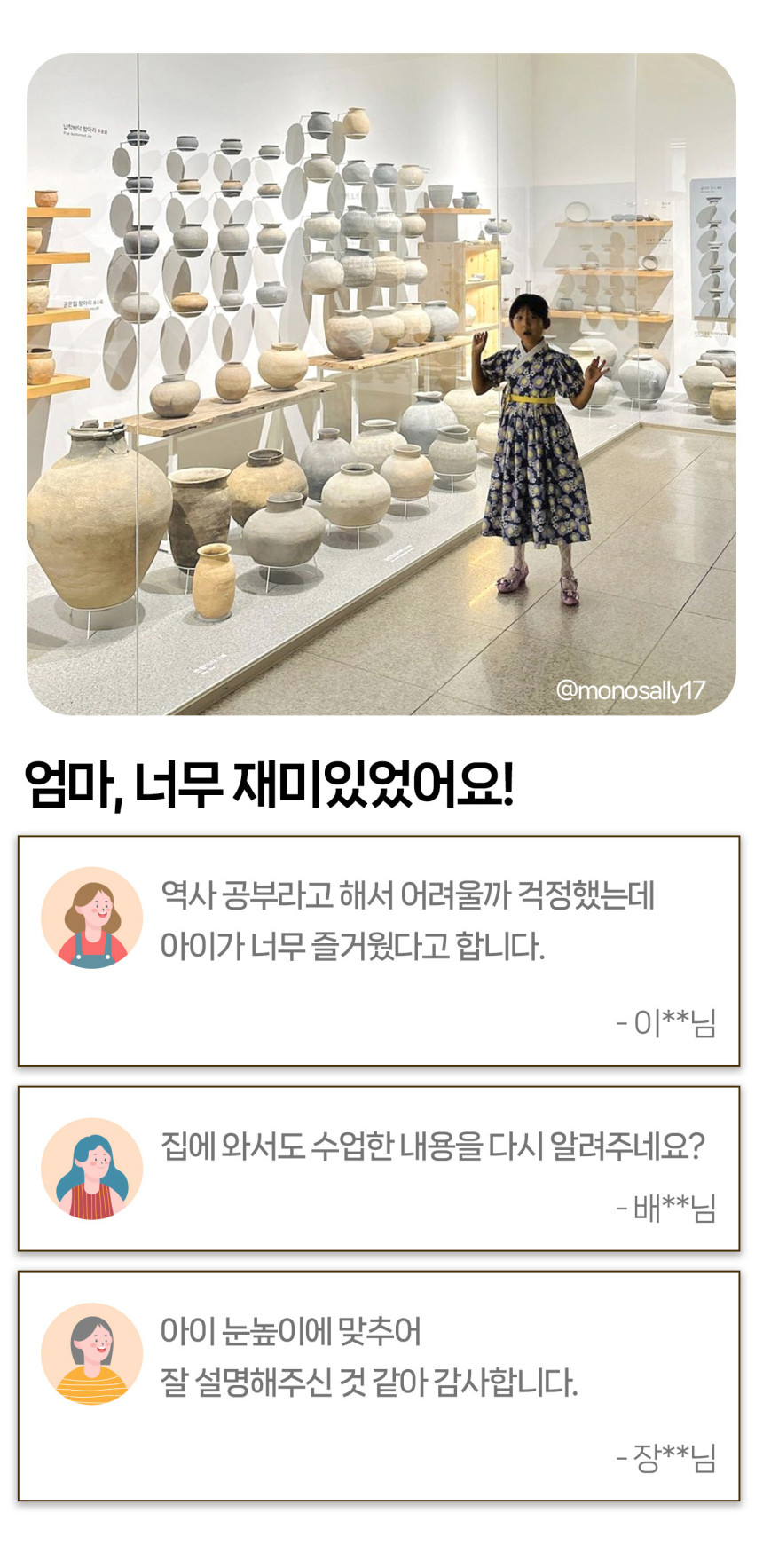 [라라클래스] 국립중앙박물관 선사시대 초등저학년 "Premium" 역사탐험대 Season3 본문: 로컬 DB 동기화 상세 평점 5 · 리뷰 3건 포함 * 특허받은 역사 커리큘럼 * 역사 전공 강사와 함께 * 초등 120분 수업 * 라라클래스 자체 제작 교재 * 연계활동 키트 불포함 - 물 - 필기도구 - 기타 개인경비 마이리얼트립에서 예약하기 서울 목록 도시 목록