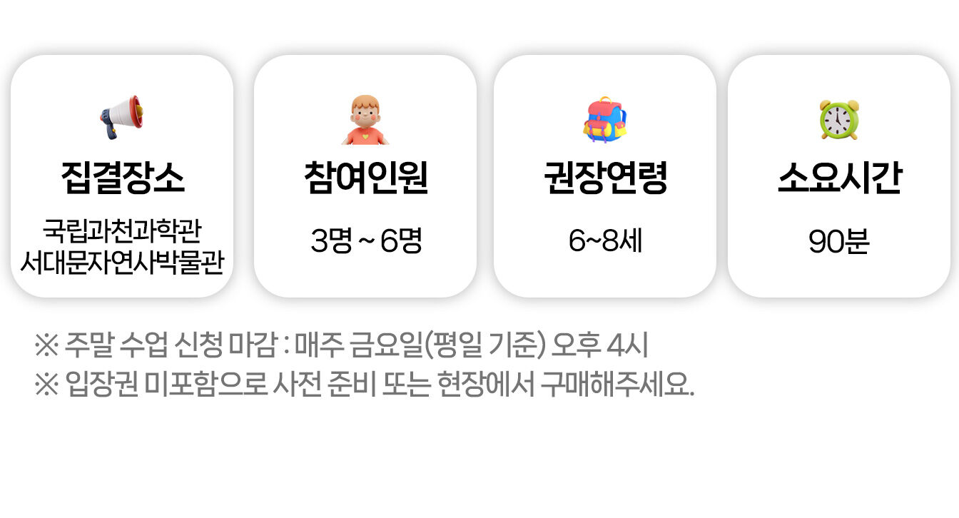 [라라클래스] 국립과천과학관 미취학 4회 완성! 물리부터 미래과학, 지구과학, 한국과학까지 본문: 로컬 DB 동기화 상세 **비슷한 연령대로 반 배정이 되고 있으나,경우에 따라 통합반으로 운영될 수 있습니다.** 포함 *과학체험 수업 *라라클래스 자체제작 교재 *과학 키트 불포함 입장권 마이리얼트립에서 예약하기 과천 목록 도시 목록