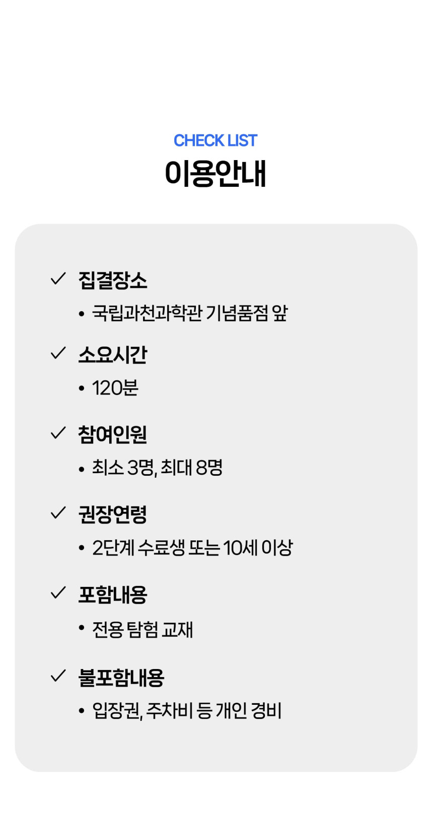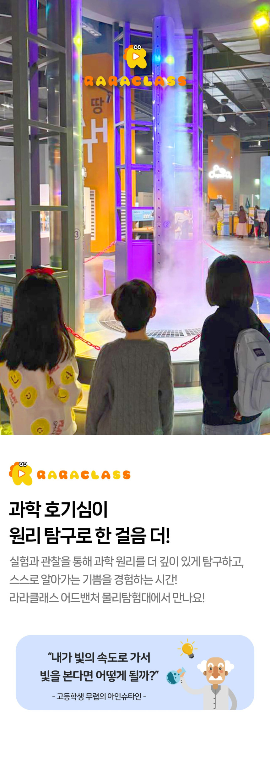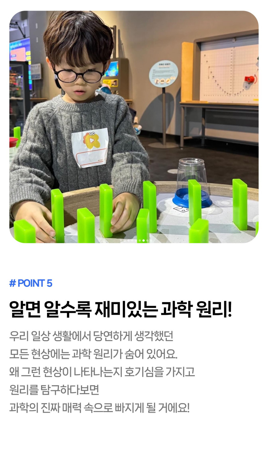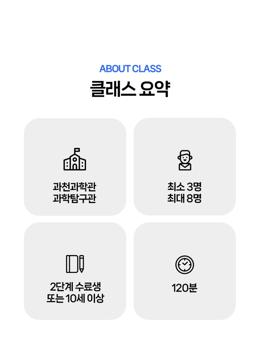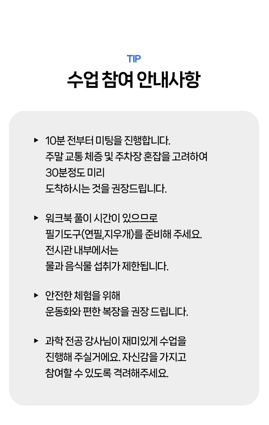 [라라클래스] 어드밴처 물리탐험대 10-13세 추천! 과학관으로 과학 원리 탐구하러 가요! 본문: 로컬 DB 동기화 상세 평점 5 · 리뷰 3건 포함 * 특허받은 과학 커리큘럼 * 과학 전공 강사와 함께 * 초등 120분 수업 * 라라클래스 자체 제작 교재 불포함 - 기타 개인경비 - 필기도구 마이리얼트립에서 예약하기 과천 목록 도시 목록