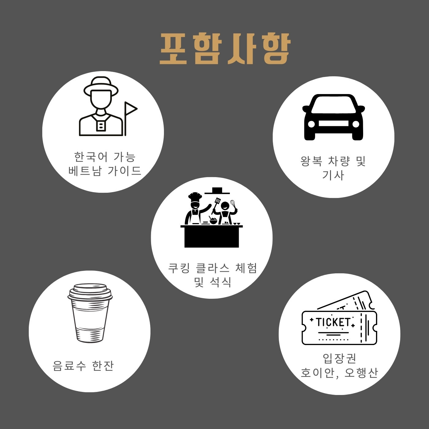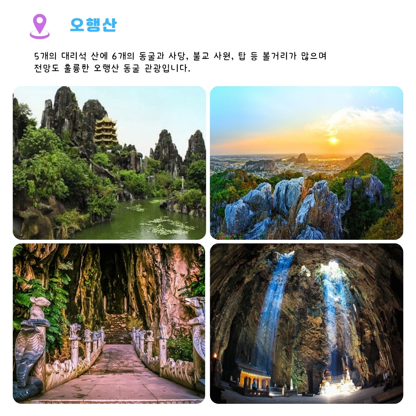 - 한국어 가능 현지인 가이드 픽업+샌딩차량+운전기사 (베트남정부 여행허가서) 오행산 입장료 카페 1인 1음료 제공 호이안 바구니배 쿠킹클래스+저녁식사 호이안 올드타운입장료