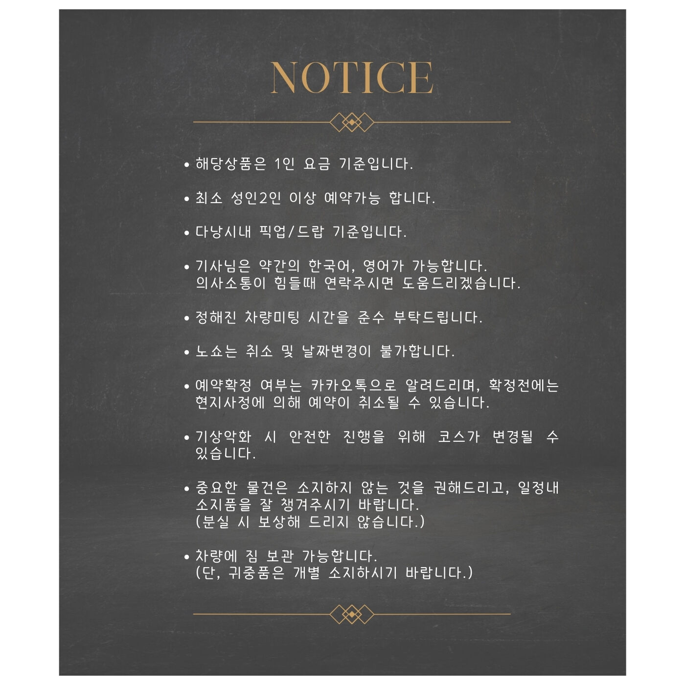 - 개인비용, 바구니배 사공 팁(1$) 다낭외 타지역 픽업/샌딩 비용 , - 인터컨티넨탈 : 100,000동/편도/1대당 - 호이안지역 : 추가요금 없습니다. - 남호이안지역 : 250,000동/편도/1대당 - 랑코지역 : 700,000동/편도/1대당 여행자보험 (개별가입을 권장드립니다) *카시트제공시 (10$추가)