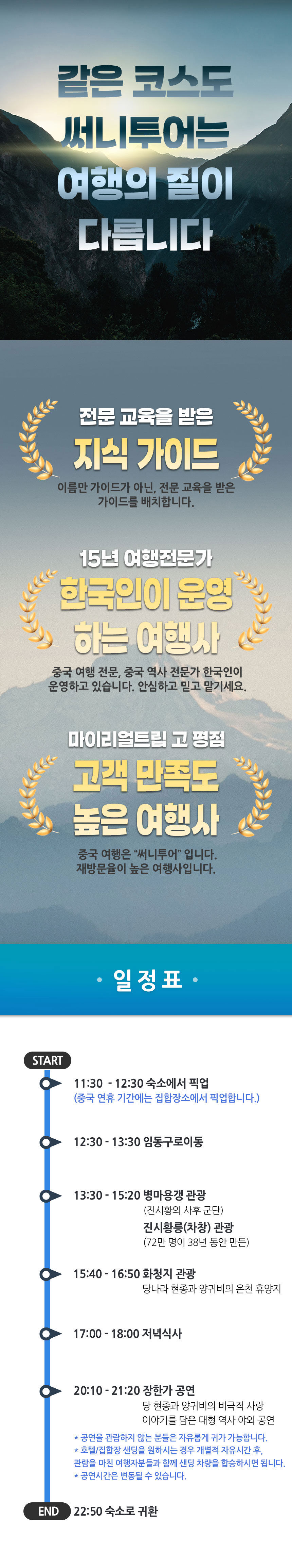 [서안] 병마용& 화청지&장한가(공연:선택) 평점 4.95 · 리뷰 20건 포함 * 지식 가이드 * 입장료(공연 선택) * 저녁식사 * 전용차량 * 가이드/기사 팁 불포함 * 개인경비 * 여행자보험 마이리얼트립에서 예약하기 시안 목록 도시 목록