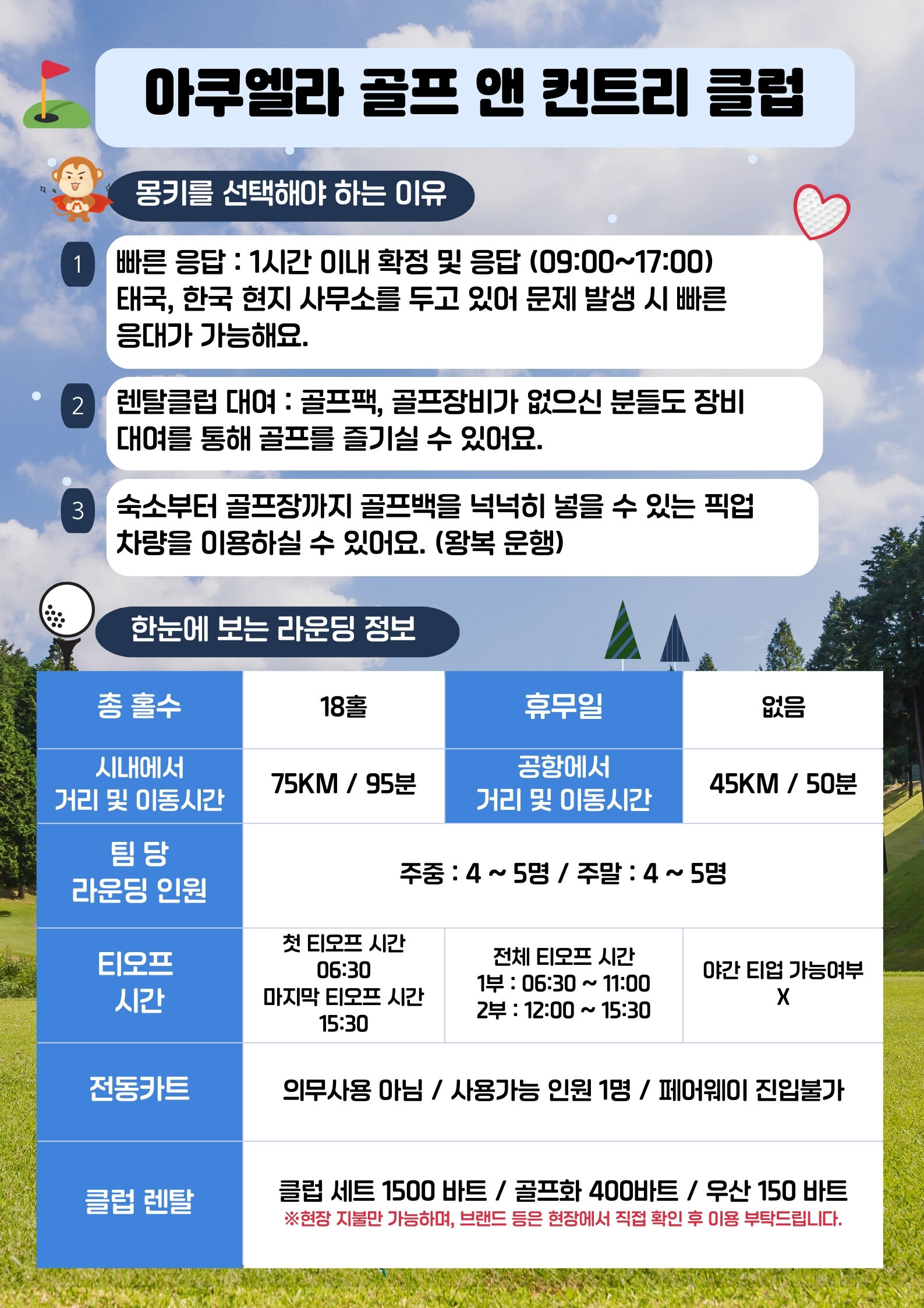 📝 골프장 소개 - 안다만 해와 인근 산의 탁 트인 전망과 신중하게 설계되어진 우거진 소나무를 통해 시각적인 즐거움을 선사해요. - 플래티넘 파스팔럼 잔디를 사용하고 있어요.