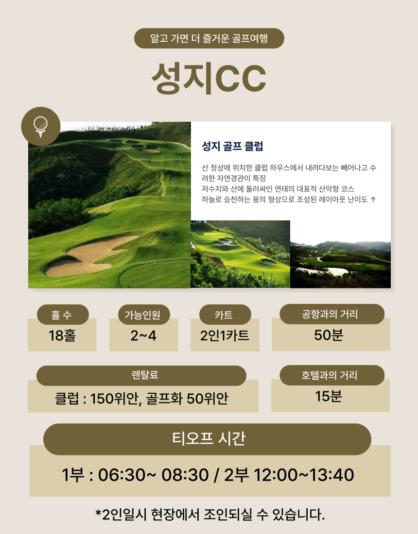 [연태] 성지CC 티온리 예약 포함 18홀 그린피 / 캐디피 / 카트비 불포함 송영 차량 여행자 보험(개별 여행자 보험 가입을 권장 드립니다) 3인시 싱글카트비 발생(120위안/18홀/1인) 캐디팁(100위안/18홀/1인) 마이리얼트립에서 예약하기 칭다오 목록 도시 목록